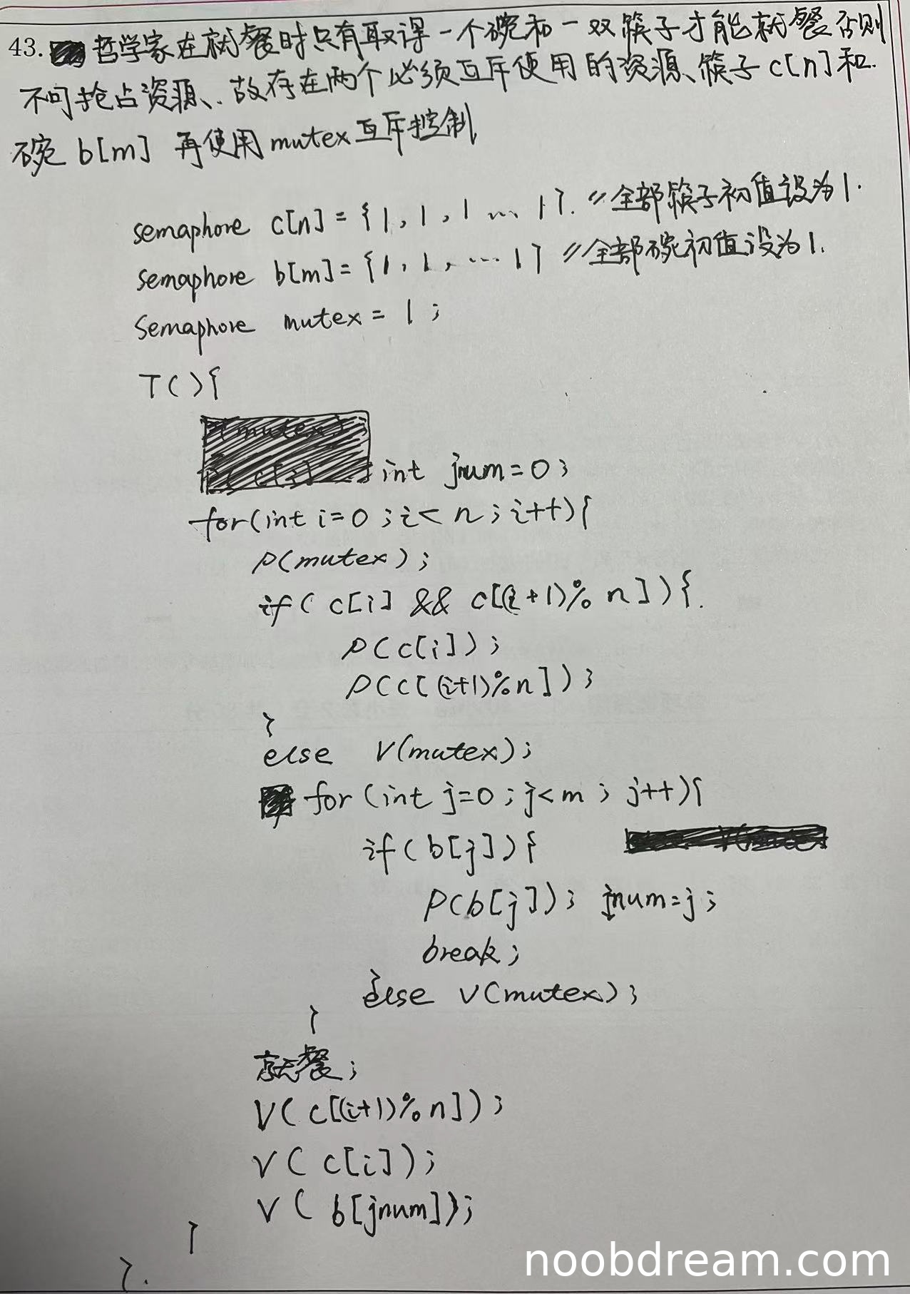 学生定义了三个信号量:c[n](筷子)、b[m](碗)和mutex(互斥锁)。其中c[n]和b[m]的初值都设为1,这与标准答案中筷子信号量初值为1一致,但碗的信号量定义方式与标准答案不同。标准答案使用一个bowls信号量表示可用碗的数量(初值为min(n-1, m)),而学生使用m个独立的碗信号量,这种思路虽然不同但理论上可行。mutex信号量的引入是为了解决资源分配时的互斥问题,但具体使用方式需要进一步分析。此部分没有明显错误,得2分。