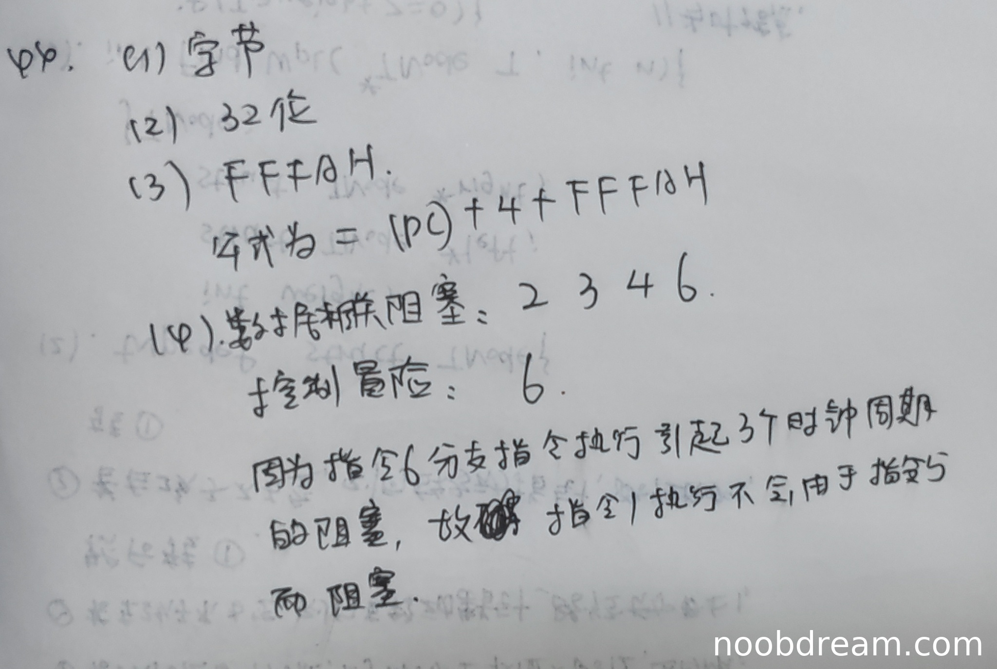 (4) 若M采用如下“按序发射、按序完成”的5级指令流水线:IF(取指)、ID(译码及取数)、EXE(执行)、MEM(访存)、WB(写回寄存器),且硬件不采取任何转发措施,分支指令的执行均引起3个时钟周期阻塞,则P中那些指令的执行会由于数据相关而发生流水线阻塞?哪条指令的执行会发生控制冒险?为什么指令1的执行不会因为与指令5的数据相关而发生阻塞?(5分)