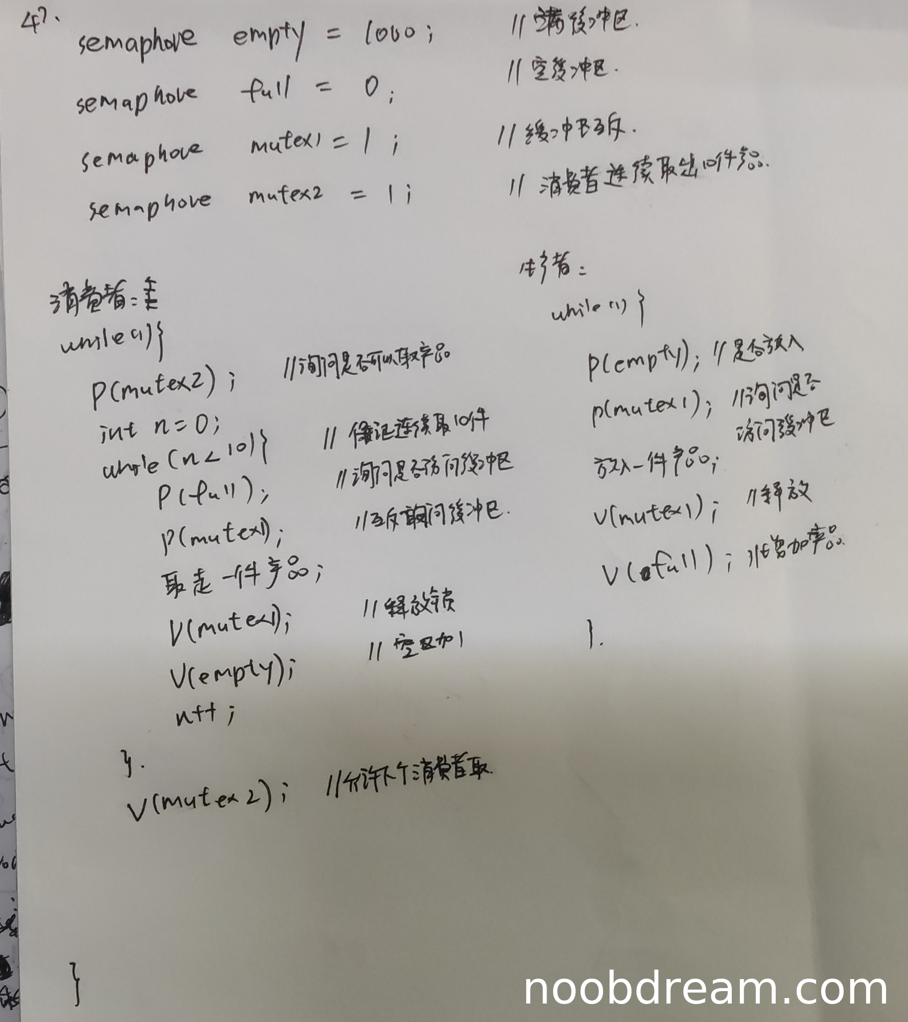 理由:消费者进程使用mutex2控制连续取10件产品的互斥是正确的,在循环内先P(full)判断是否有产品,再P(mutex1)互斥访问缓冲区,然后取产品,最后V(mutex1)释放互斥锁和V(empty)增加空位数,这些操作顺序正确。但是,循环条件"while (n < 10)"会导致消费者连续取10件产品,这与题目要求的"从缓冲区连续取出10件产品"相符,但标准答案使用的是for循环,这只是实现方式的差异,思路正确不扣分。不过,学生在循环内没有进行产品消费的操作,这是一个小的逻辑缺陷,扣1分。