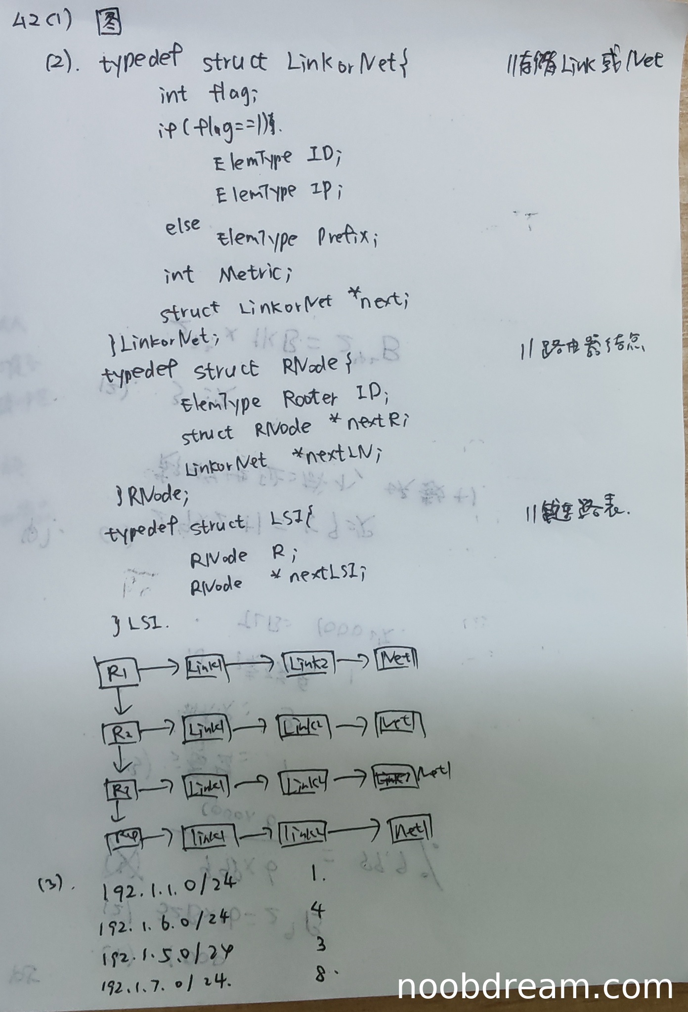 ⑵ 针对题42表中的内容,设计合理的链式存储结构,以保存题42表中的链路状态信息(LSI)。要求给出链式存储结构的数据定义,并画出对应题42表的链式存储结构示意图(示意图中仅以ID标识结点)。(5分)