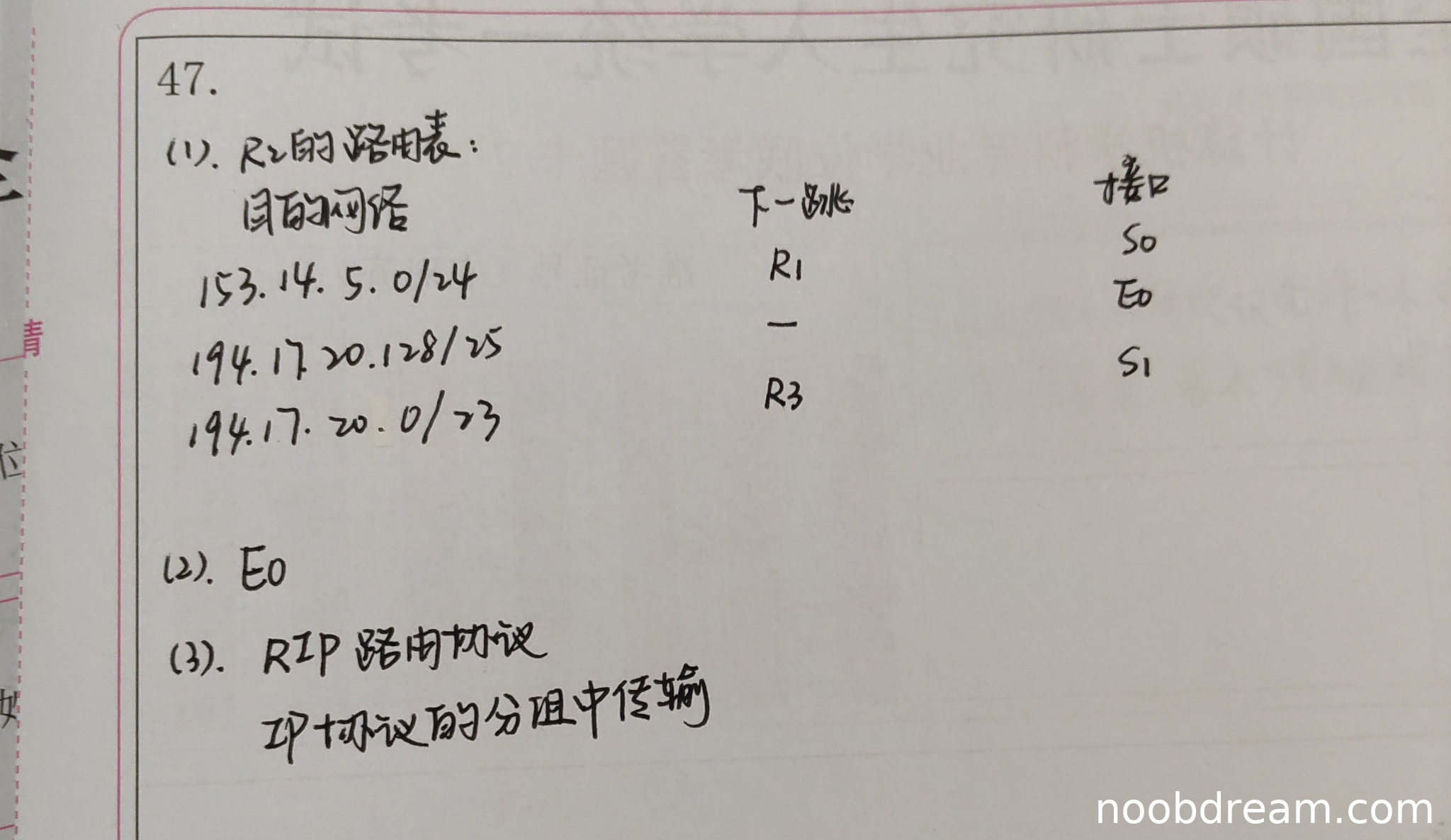 学生回答"E0"与标准答案一致。根据最长匹配原则,目的IP地址194.17.20.200与194.17.20.128/25(掩码长度25)比194.17.20.0/23(掩码长度23)更匹配,因此通过E0接口转发是正确的。给满分1分。