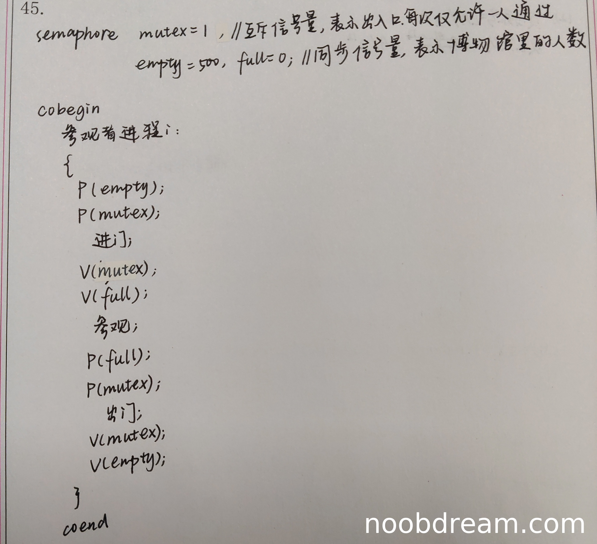 学生定义了三个信号量:mutex=1(互斥信号量,控制出入口)、empty=500(表示博物馆剩余容量)、full=0(表示博物馆内当前人数)。标准答案只需要mutex和empty两个信号量,full是多余的。但empty和mutex的定义和初值正确,含义说明也正确。由于full是多余的但不影响核心逻辑,且empty和mutex部分完全正确,扣1分。得3分。