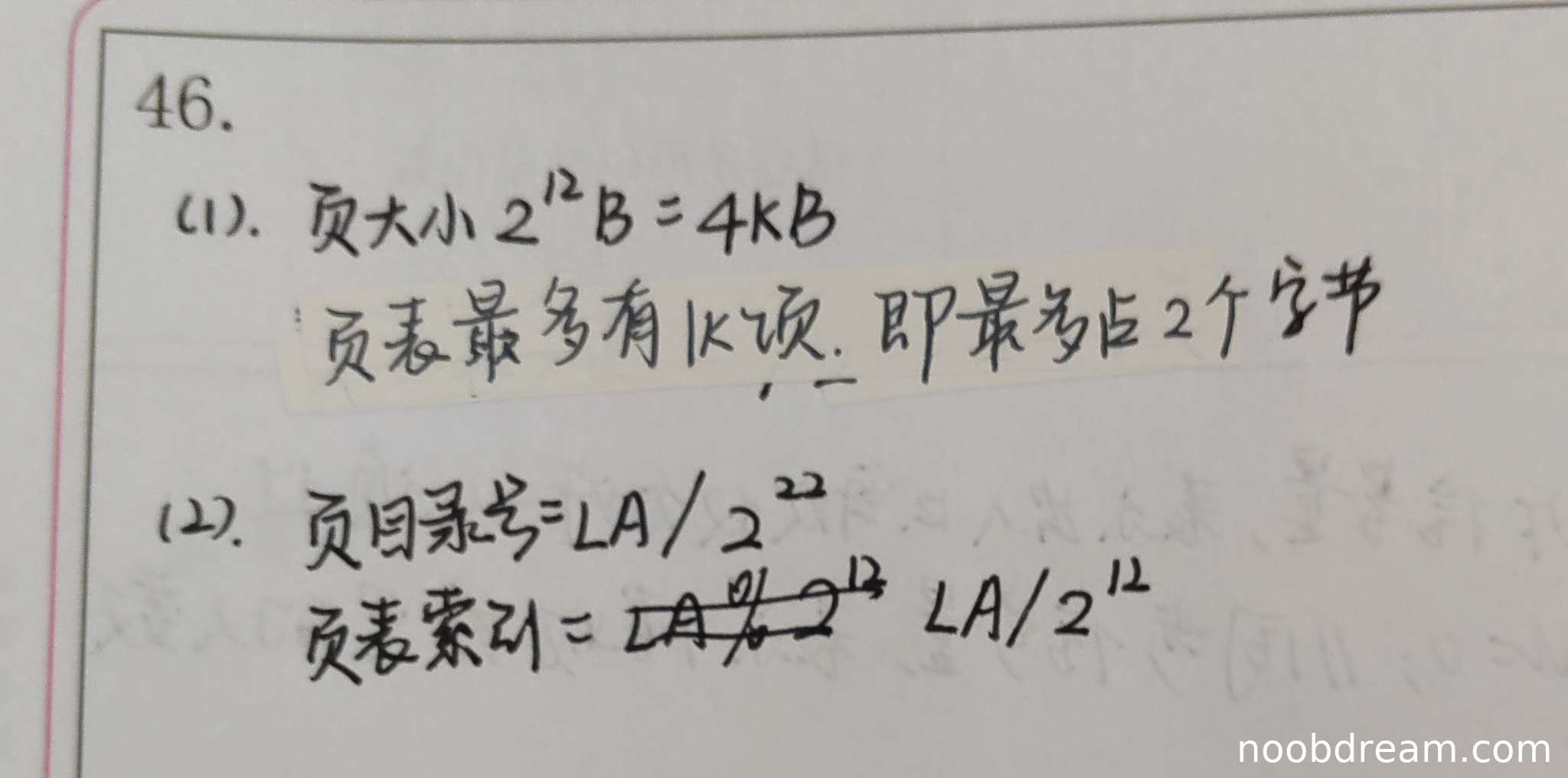学生答案中页大小计算正确(2¹²B = 4KB),得1分。但页表项数量计算错误:逻辑地址32位,页内偏移12位,故页号应为20位,页表项数应为2²⁰个,而非1K(2¹⁰)项;页表最大占用应为2²⁰ × 4B = 4MB,学生答"最多占2个字节"明显错误。因此页表大小部分不得分。本小题得1分。