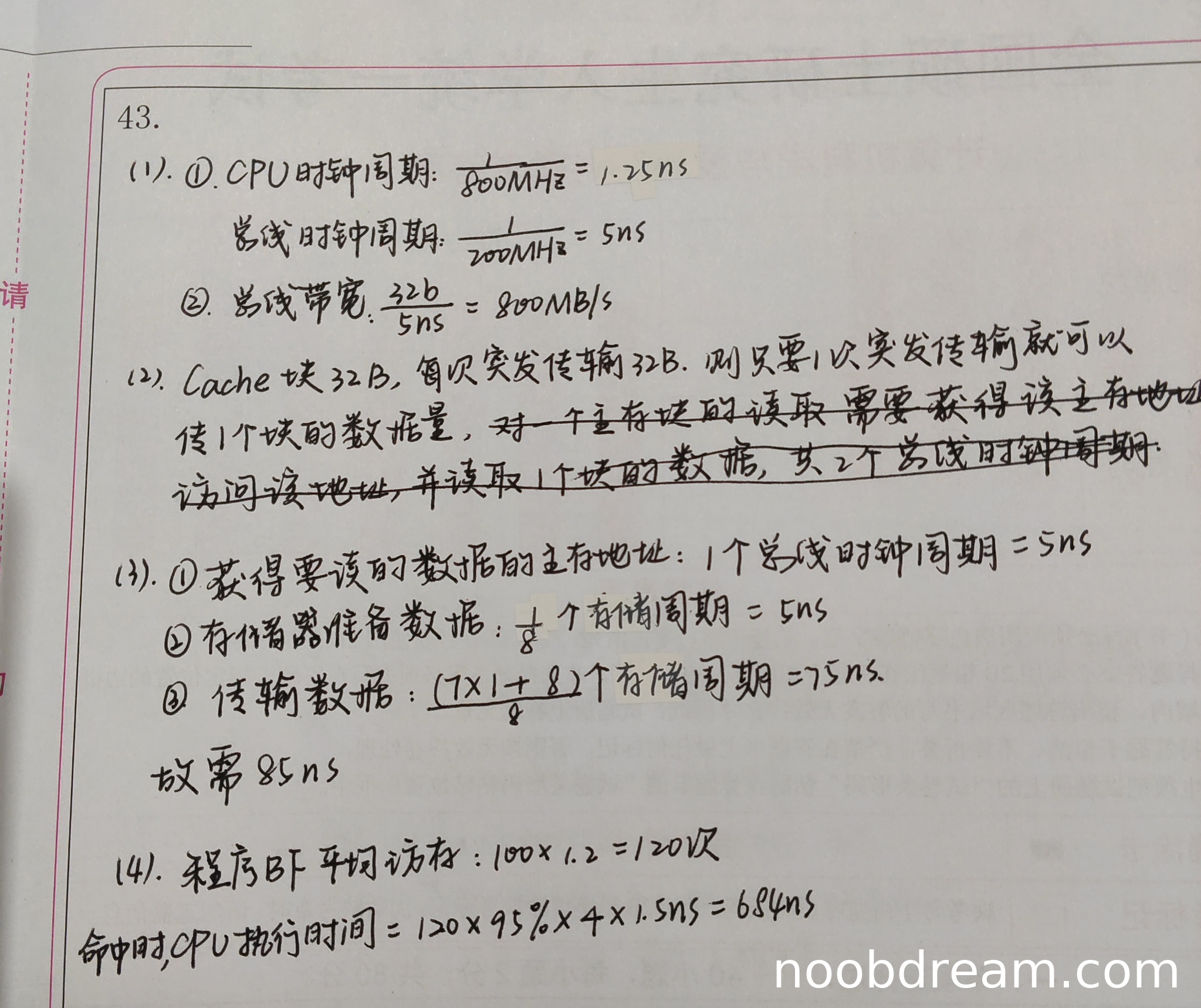 学生答案正确计算了CPU时钟周期(1.25ns)、总线时钟周期(5ns)和总线带宽(800MB/s),计算过程和结果与标准答案完全一致。得3分。
