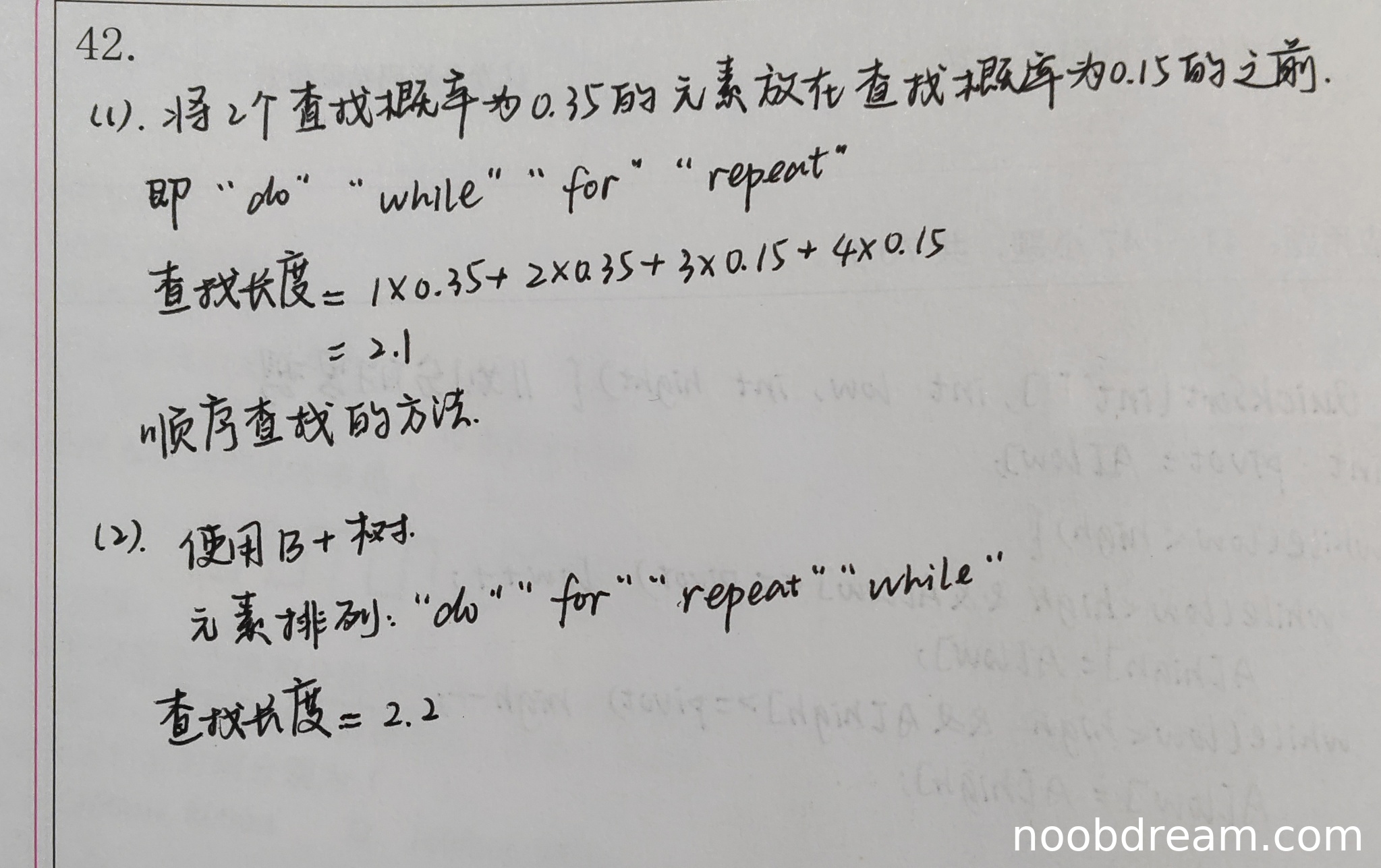 学生正确指出应将查找概率高的元素排列在前(具体排列为"do"、"while"、"for"、"repeat"),这符合按查找概率降序排列的原则(2分)。正确采用顺序查找方法(1分)。计算过程正确,平均查找长度=1×0.35+2×0.35+3×0.15+4×0.15=2.1,结果正确(2分)。本小题得5分。