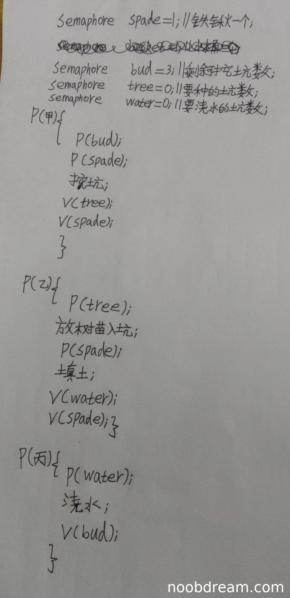 甲进程正确执行:wait(bud)检查可挖坑数→wait(spade)获取铁锹→挖坑→signal(tree)通知乙有坑待种→signal(spade)释放铁锹。逻辑完整且与标准答案等效。得2分。