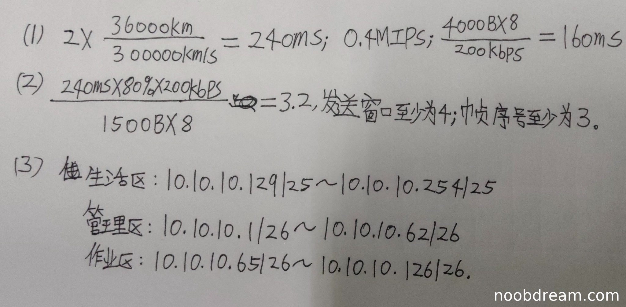 学生第一问计算单向传播时延时使用了往返距离(2×36000km),但题目要求的是单向传播时延,应为36000km/300000km/s=120ms,学生计算为240ms,属于逻辑错误,扣1分。最大吞吐量学生写为"0.4MIPS",单位错误且数值应为200kbps,但可能为识别错误,根据禁止扣分原则不扣分。文件传输时间计算为160ms,但标准答案为280ms(包含传播时延),学生忽略了传播时延,属于逻辑错误,扣1分。本小题得1分。