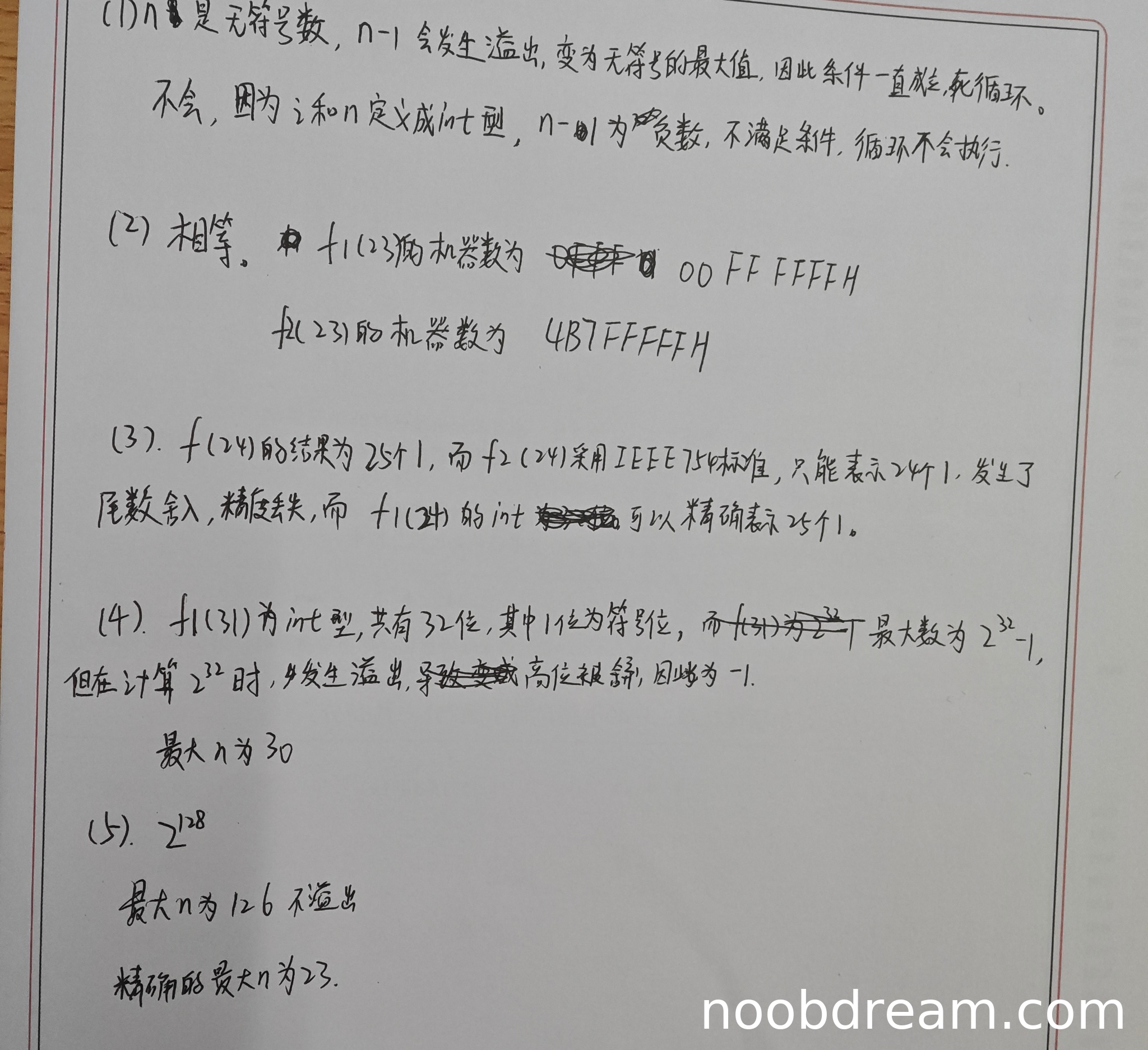 学生回答正确解释了f1(31)返回-1的原因(int型溢出,机器数为全1解释为-1),并正确指出最大n为30。得2分。