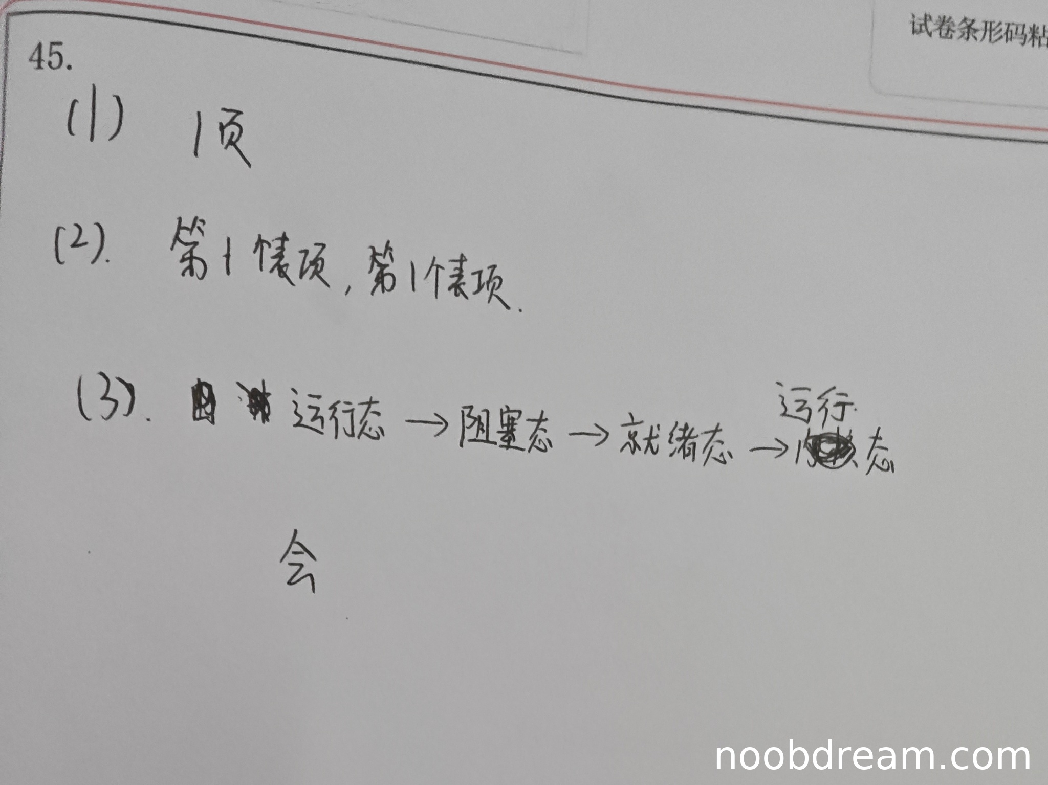 学生回答“由运行态→阻塞态→就绪态→运行态”,正确描述了进程状态变化过程,符合标准答案要求(执行态→阻塞态→就绪态→运行态)。但未明确回答“CPU是否会进入内核态”的问题,只回答“会”字不完整。根据标准答案,CPU状态变化是得分点之一,此处缺少完整表述,扣1分。得3分。