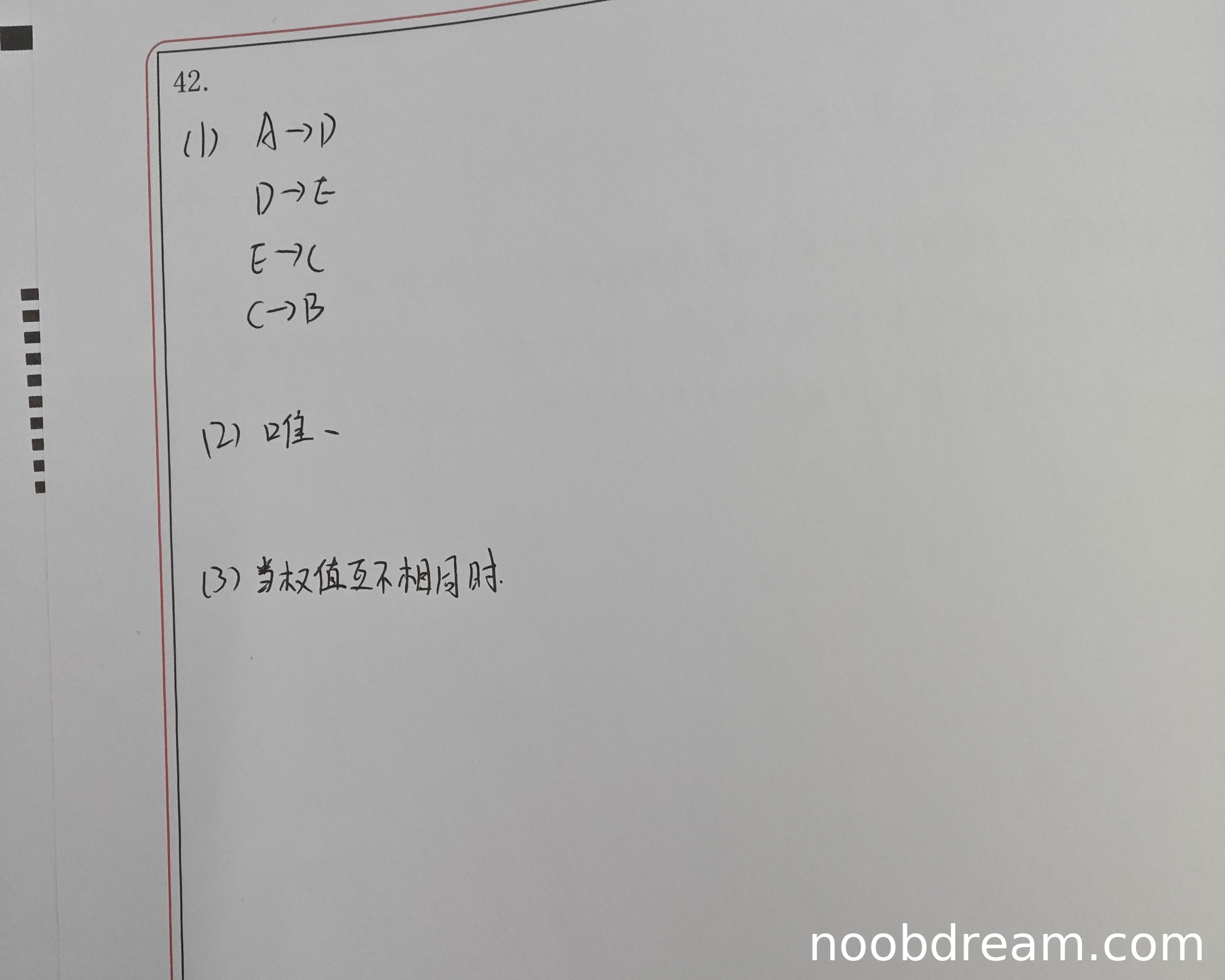 学生给出的边依次为:A→D、D→E、E→C、C→B。这些边与标准答案 (A,D)、(D,E)、(C,E)、(B,C) 完全一致,且顺序正确。虽然学生用箭头表示边,但表达的含义与标准答案相同。因此得4分。