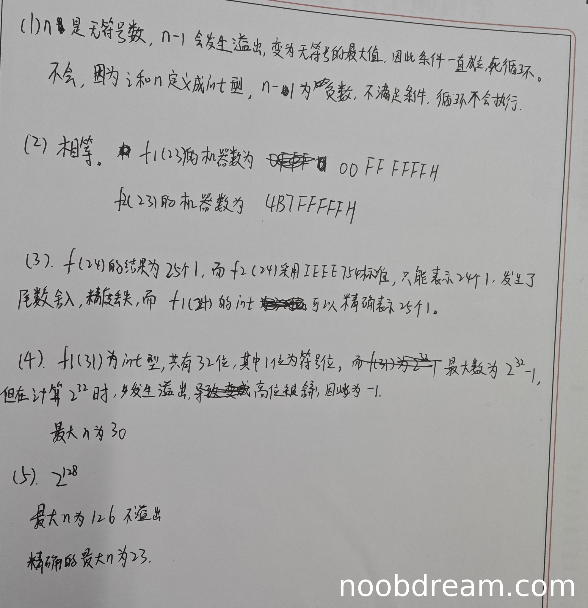 学生回答f2(127)对应值“2¹²⁸”错误,应为+∞;最大n不溢出为126正确;精确最大n为23正确。因此第一部分错误,扣1分,后两部分正确,得2分。