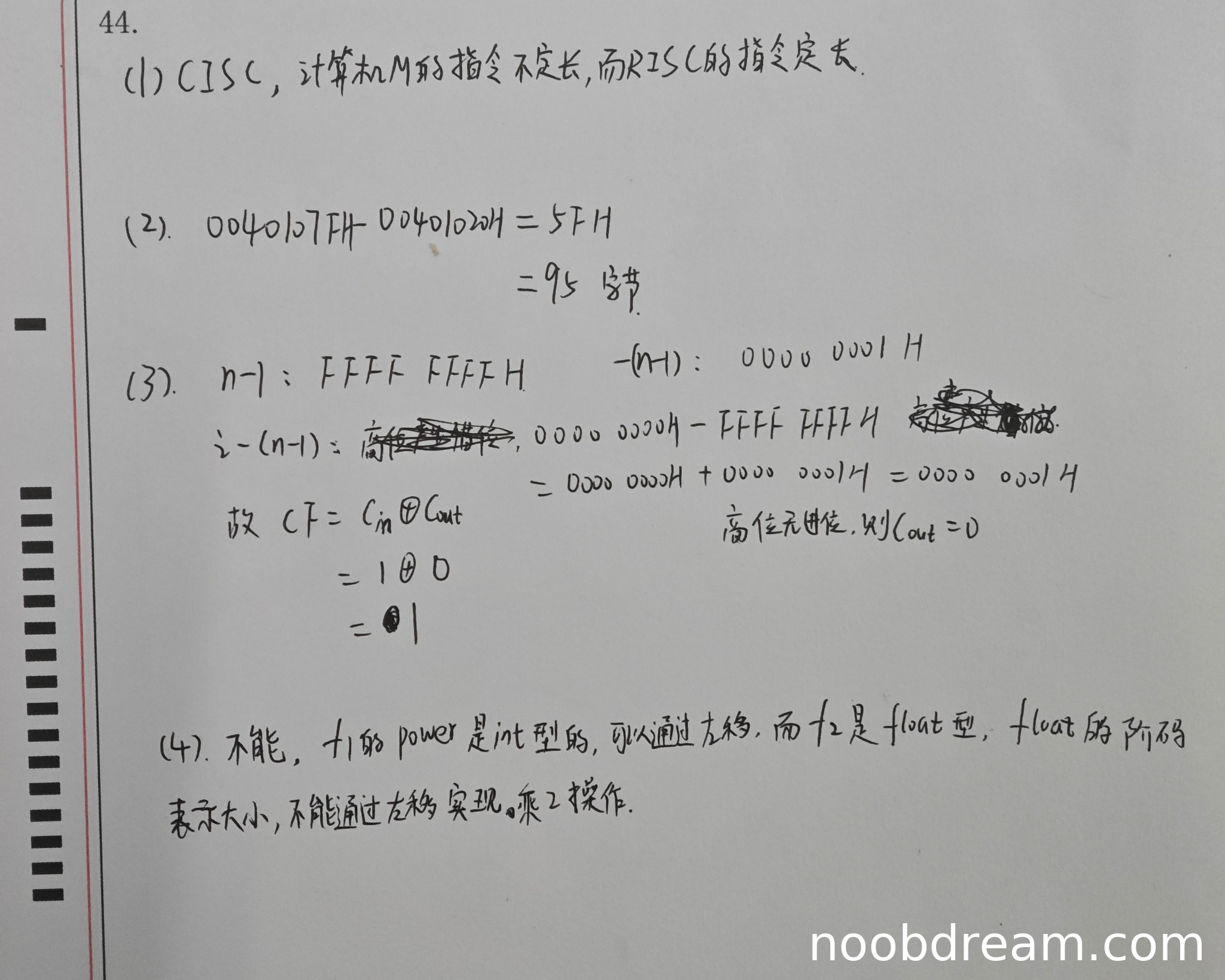 学生正确得出CF=1,并给出计算过程:n-1=FFFFFFFFH,-(n-1)=00000001H,CF=Cin⊕Cout=1⊕0=1。虽然表述与标准答案略有差异,但思路正确且结果一致。得3分。