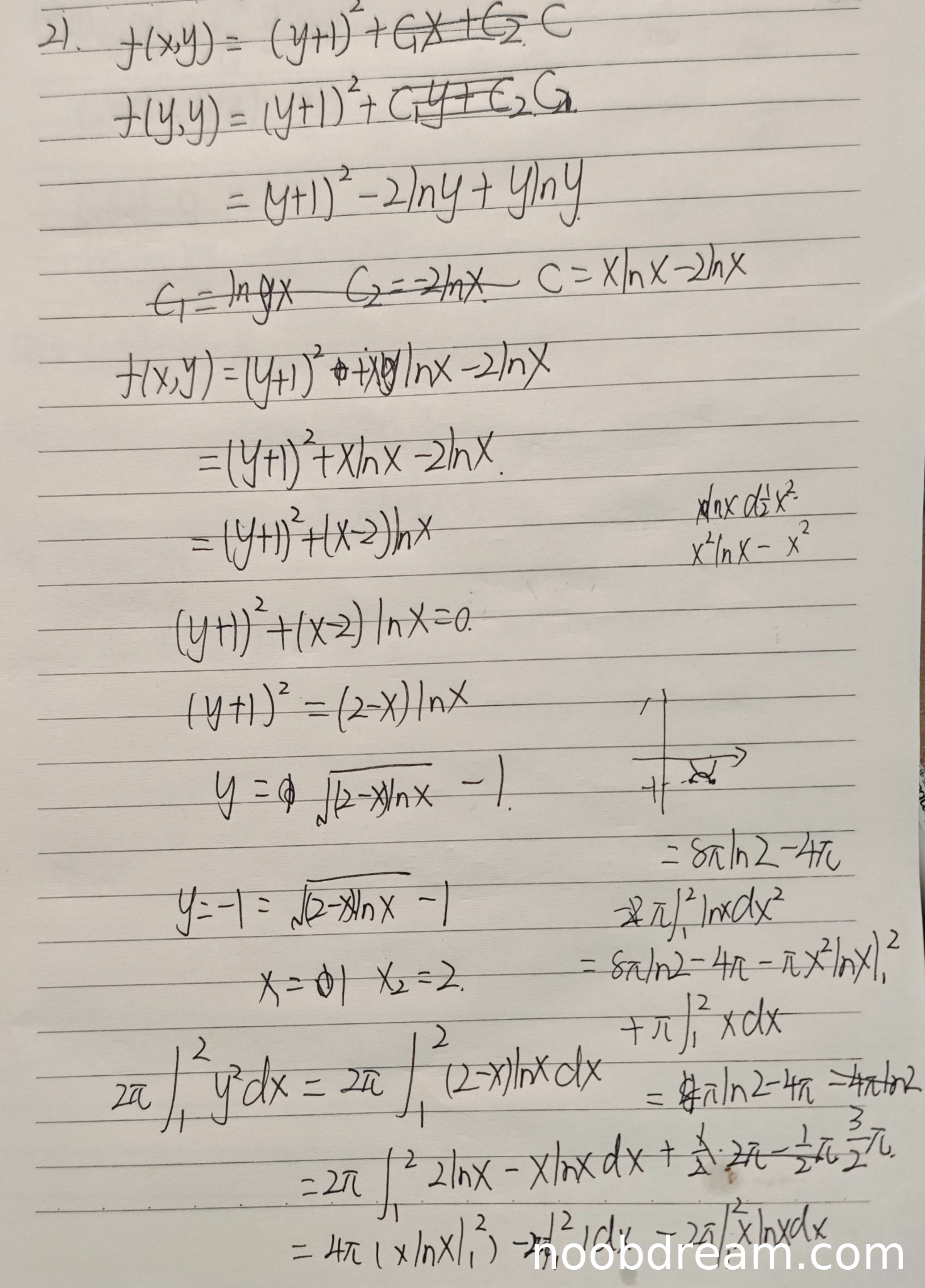 学生错误地使用了 \(2\pi\int_1^2 y^2 dx\) 来计算旋转体体积。正确应该是绕 \(y=-1\) 旋转,体积应为 \(\pi\int_1^2 (y+1)^2 dx\)。虽然学生将 \((y+1)^2\) 替换为 \((2-x)\ln x\) 是正确的,但前面的系数错误(应该是 \(\pi\) 而不是 \(2\pi\)),且积分对象应该是 \((y+1)^2\) 而不是 \(y^2\)。这是一个严重的逻辑错误,扣2分。计算过程中积分结果也错误,但这是由基本公式错误导致的。得1分。