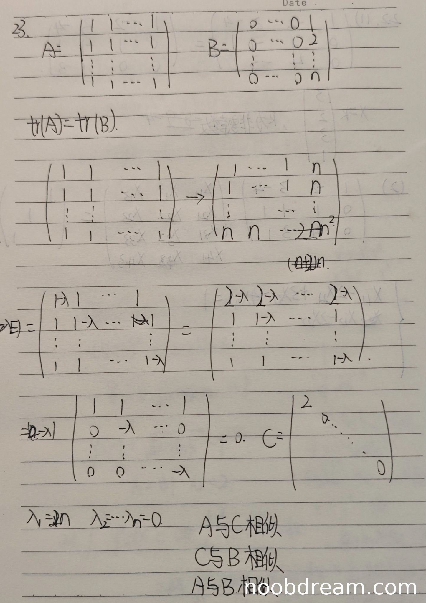 学生作答的整体思路是正确的,通过计算两个矩阵的特征值,并证明它们都可对角化,从而利用相似关系的传递性得出结论。具体分析如下:
