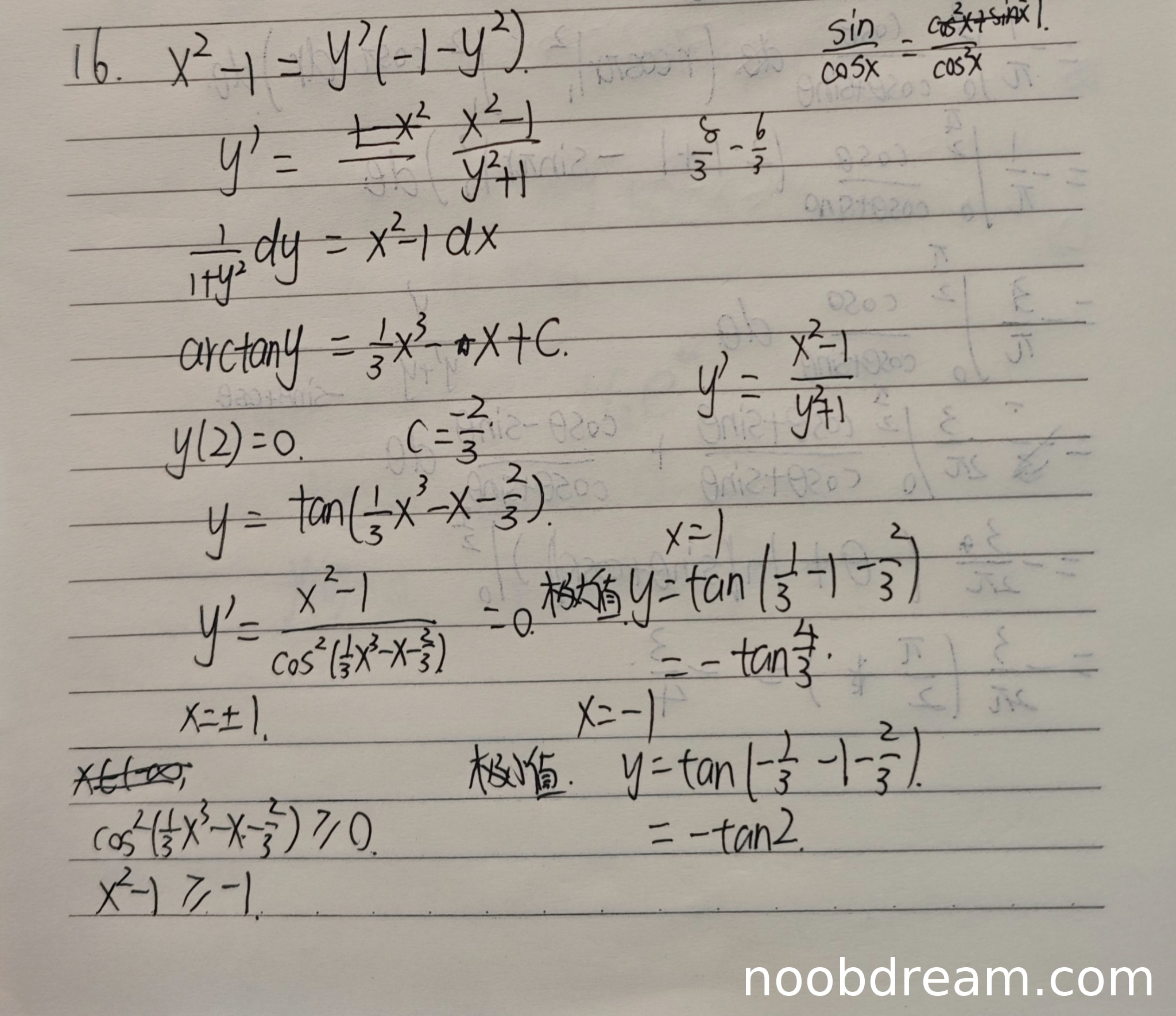 学生将原方程变形为 \(y' = \frac{x^2 - 1}{y^2 + 1}\) 是正确的,但后续积分过程出现错误。标准答案为 \(\frac{1}{3}y^3 + y = x - \frac{1}{3}x^3 + C\),而学生得到 \(\arctan y = \frac{1}{3}x^3 - x + C\),这是对微分方程积分时的错误。因此扣2分,得1分。