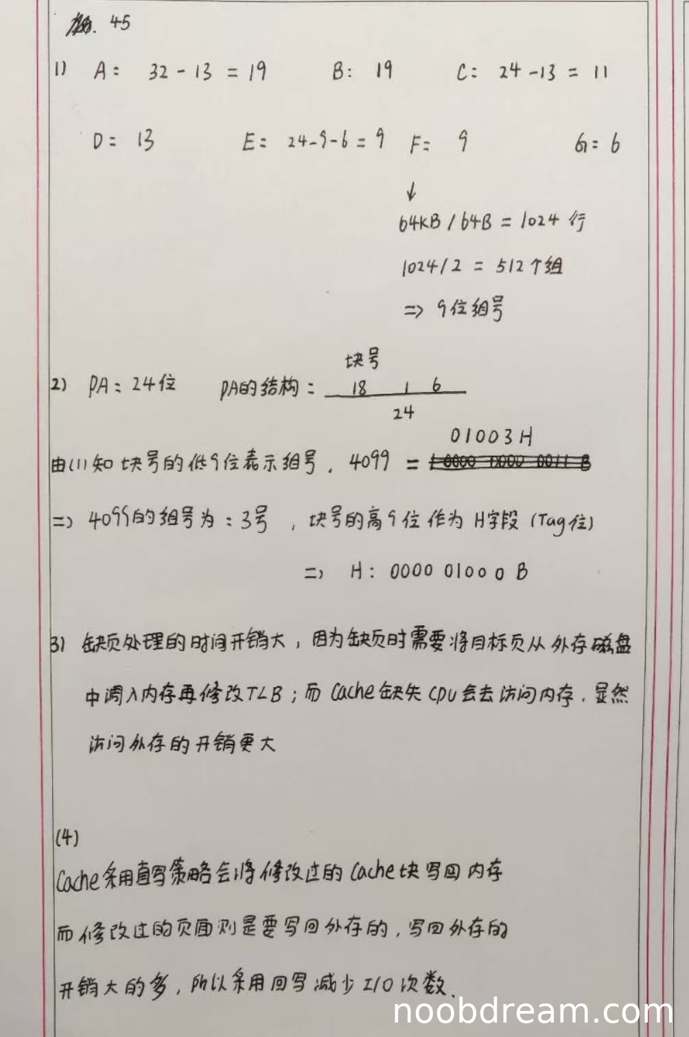 学生答案中A=19、B=19、C=11、D=13、E=9、F=9、G=6,与标准答案完全一致,得7分。TLB标记字段B中存放的是虚页号,学生未明确回答此内容,但根据上下文可推断其理解正确,但未直接说明,扣1分。本小题得7分。