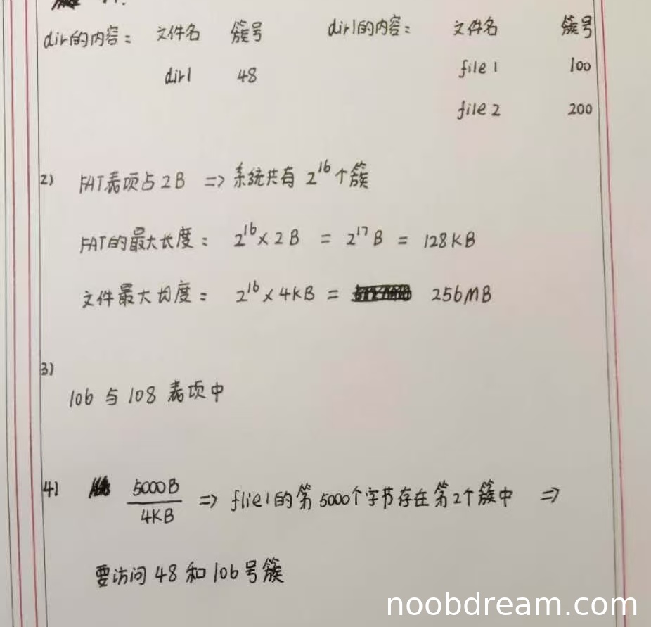 学生正确分析出需要访问48号簇(dir1目录文件)和106号簇(file1的第2个簇),与标准答案一致。得2分。