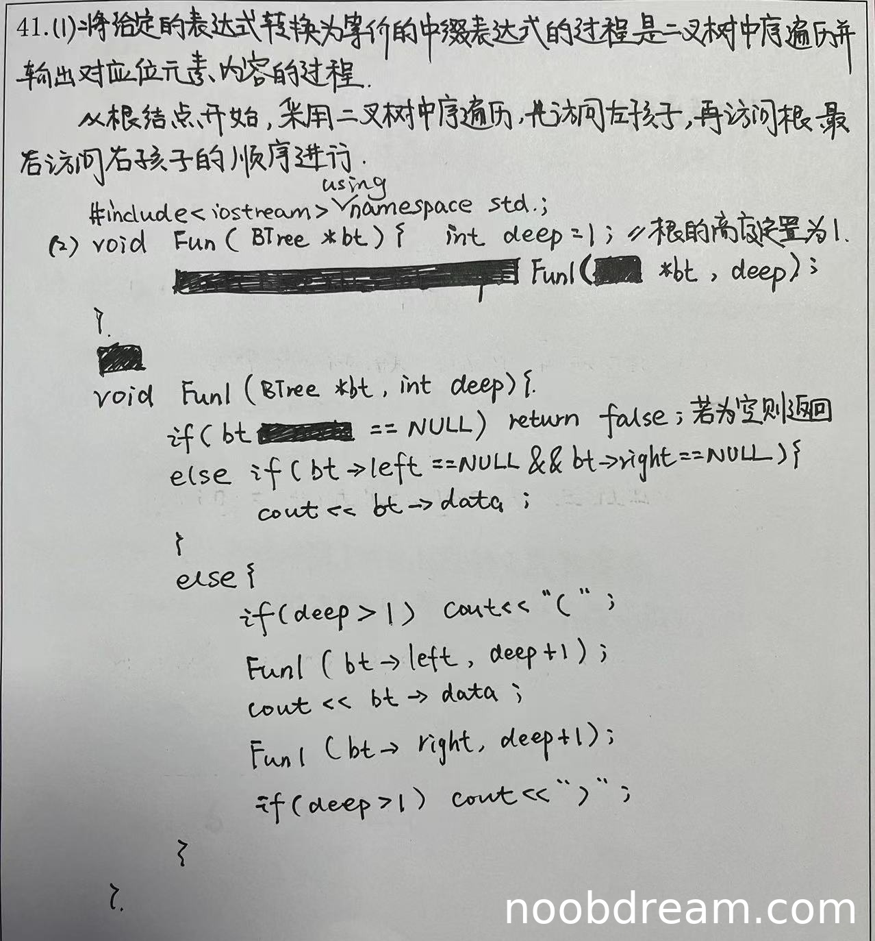 理由:算法实现基本正确,采用了与标准答案相同的递归中序遍历方法,并根据深度参数在适当位置添加括号。但存在以下问题: