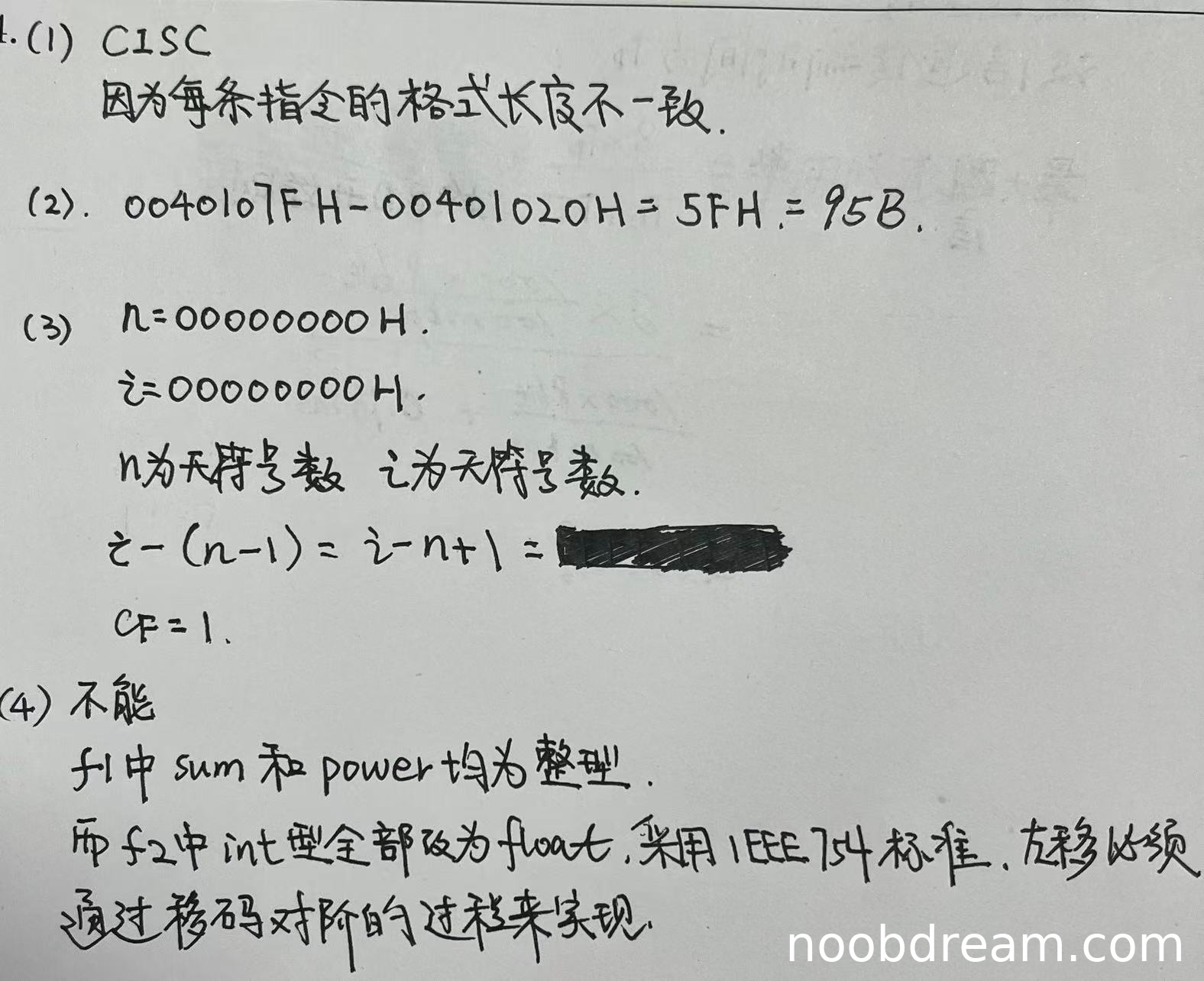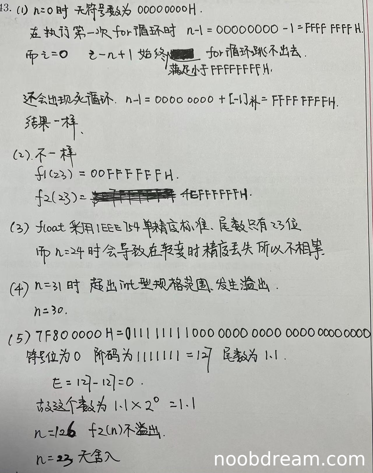 学生对7F800000H的解释错误(误认为是1.1×2⁰),实际上这是+∞。但正确给出了不溢出的最大n=126和精确无舍入的最大n=23。由于对机器数解释错误,扣1分。