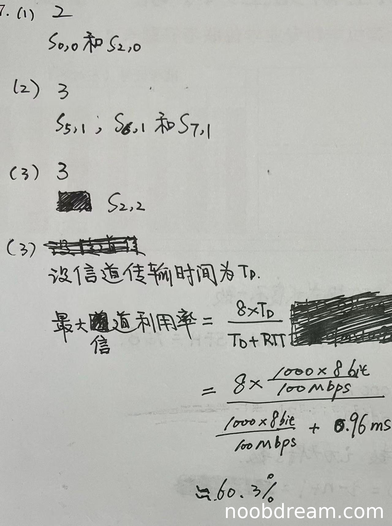 其中窗口大小=7,帧传输时间=1000×8bit/100Mbps=0.08ms,RTT=0.96ms。