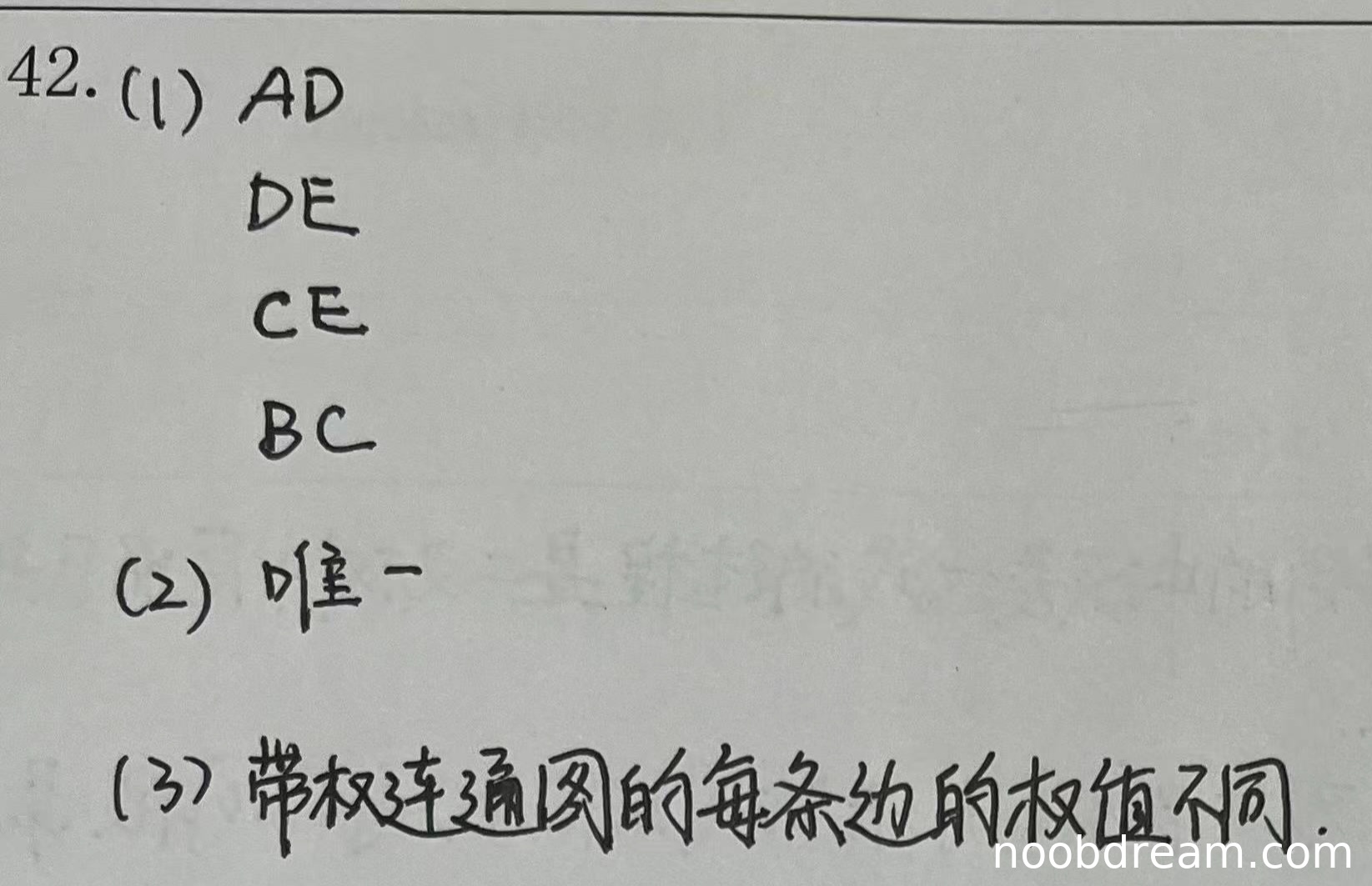 学生回答"带权连通图的每条边的权值不同",这与标准答案"当带权连通图的任意一个环中所包含的边的权值均不相同时,其MST是唯一的"在本质上是一致的。因为如果图中所有边的权值都不同,那么任意环中的边权值必然不同,这是一个充分条件。虽然表述不如标准答案精确,但思路正确,因此得2分。