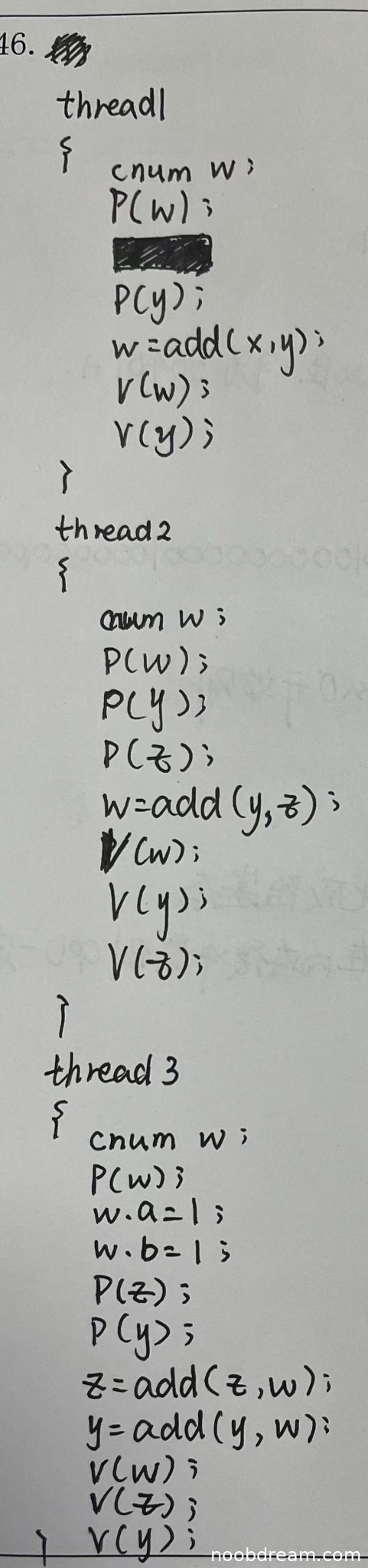 学生答案中未明确定义信号量,而是直接使用P、V操作,且使用的信号量标识符与变量名相同(如P(w)、P(y)等),这会导致混淆和错误。标准答案中明确定义了三个信号量用于保护共享变量y和z的互斥访问。学生答案在信号量定义部分得0分。