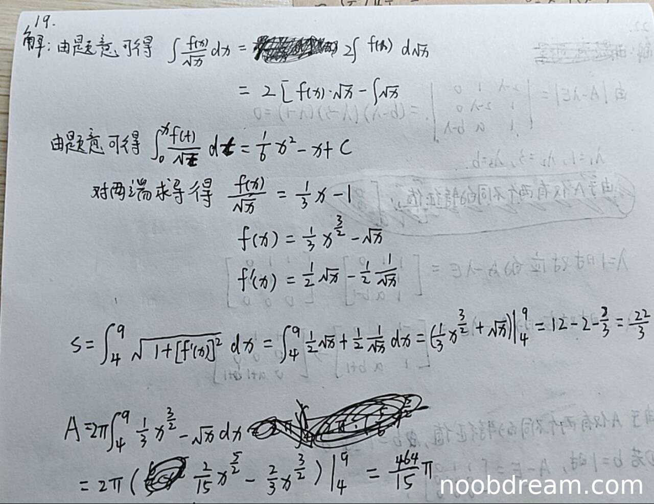 学生正确应用旋转体侧面积公式,但在计算A时出现了严重错误。学生写的是A = 2π∫₄⁹(1/3x^(3/2)-√x)dx,漏掉了√(1+[f'(x)]²)这个关键因子。这导致整个计算思路错误,最终结果464π/15也是错误的。根据逻辑错误扣分原则,这一问只能得0分。