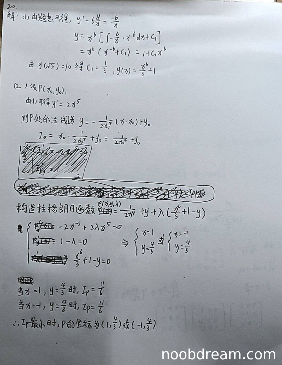 学生正确计算导数 \(y' = 2x^5\),并写出法线方程。但在求截距 \(I_p\) 时,误将截距表示为 \(Z_P = \frac{1}{2x_0^4} + y_0\)(应为 \(Y\) 轴截距,即 \(X=0\) 时的 \(Y\) 值),导致后续使用拉格朗日乘数法求解时目标函数错误。尽管最终得到点 \((1, \frac{4}{3})\) 正确,但包含错误点 \((-1, \frac{4}{3})\)(不符合 \(x > 0\) 条件),且方法复杂化。核心逻辑错误(截距表达式错误)扣2分,多解扣1分。得3分。