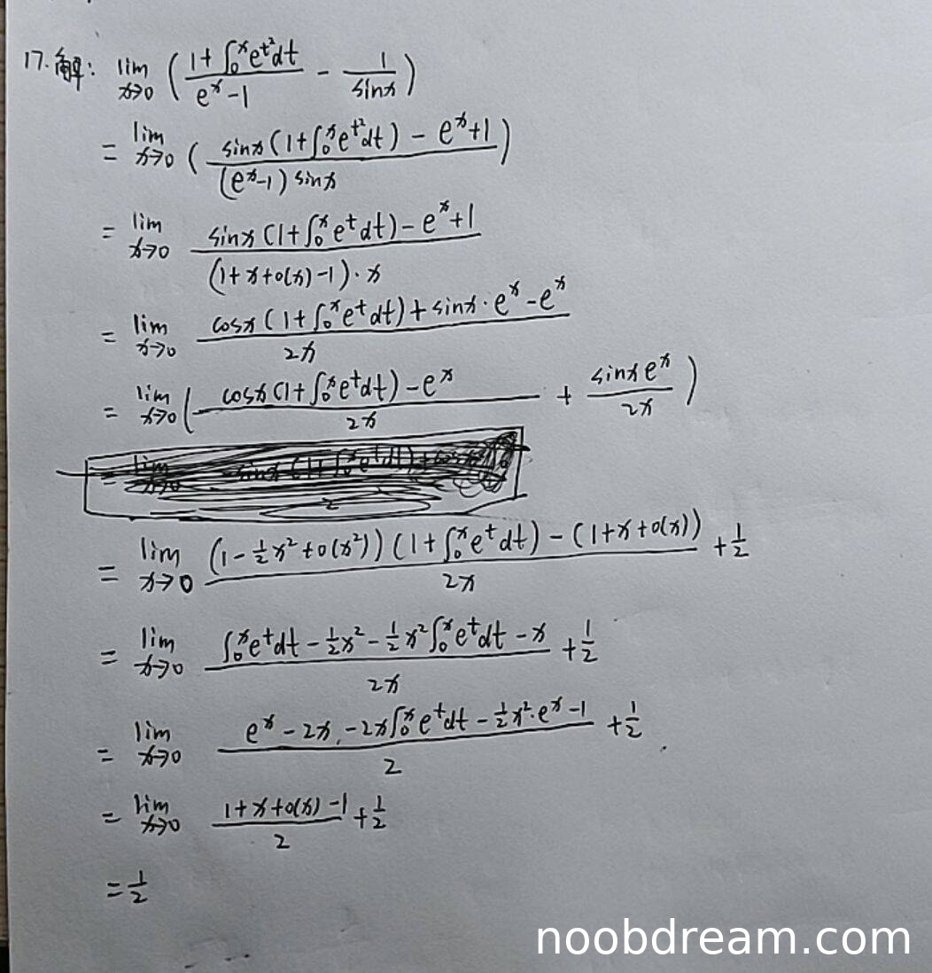 学生作答的整体思路正确:首先通分,然后使用等价无穷小替换分母,再使用洛必达法则和泰勒展开进行计算。最终得到了正确的结果1/2。