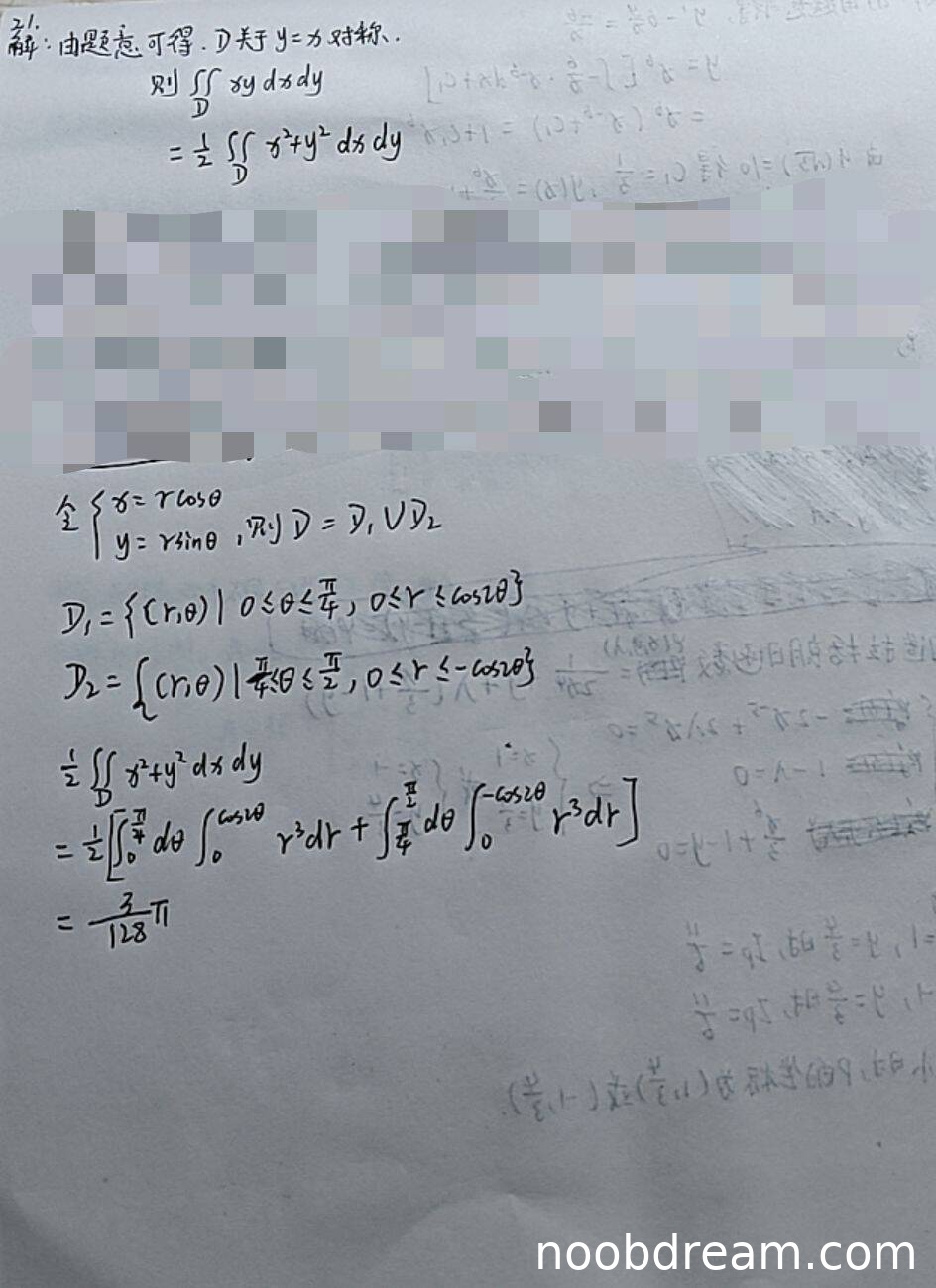 学生作答思路:首先利用对称性将积分转化为 \(\frac{1}{2}\iint_D (x^2+y^2)dxdy\),然后采用极坐标变换进行计算。这一思路是合理的,因为区域D确实关于直线 \(y=x\) 对称,且被积函数 \(xy\) 在对称性下可以这样处理。