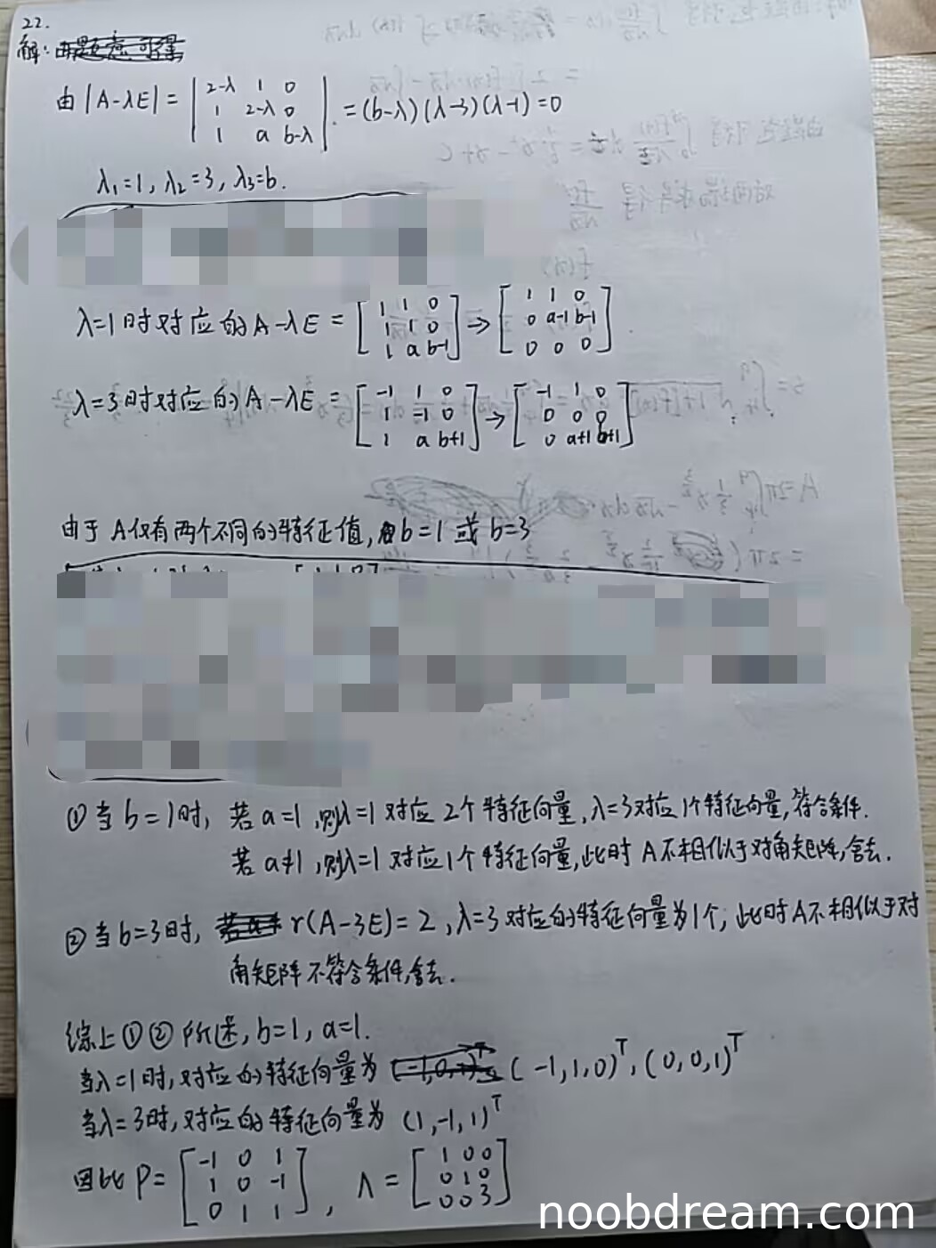 理由:学生正确计算了特征多项式,得到特征值λ₁=1,λ₂=3,λ₃=b。正确分析b=1或b=3两种情况。对于b=1的情况,正确得出a=1。但对于b=3的情况,学生错误地认为r(A-3E)=2,实际上当b=3且a=-1时,r(3E-A)=1,A可以相似对角化。这部分分析错误,扣2分。