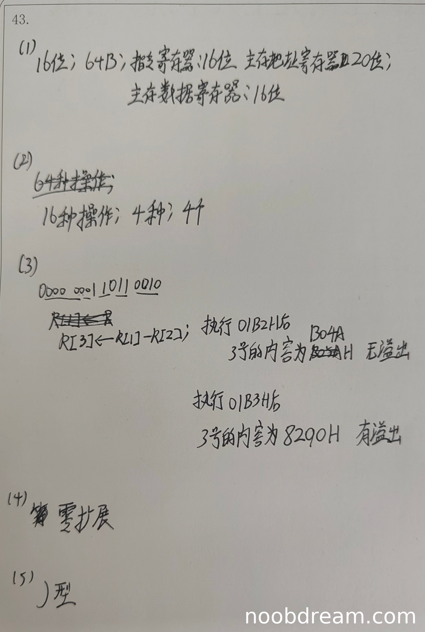 学生答案中,指令功能描述基本正确(1分);执行01B2H后3号寄存器内容B04AH正确(1分),溢出判断正确(1分);执行01B3H后3号寄存器内容8290H错误(扣1分),但溢出判断正确(1分)。本小题得分为4分。