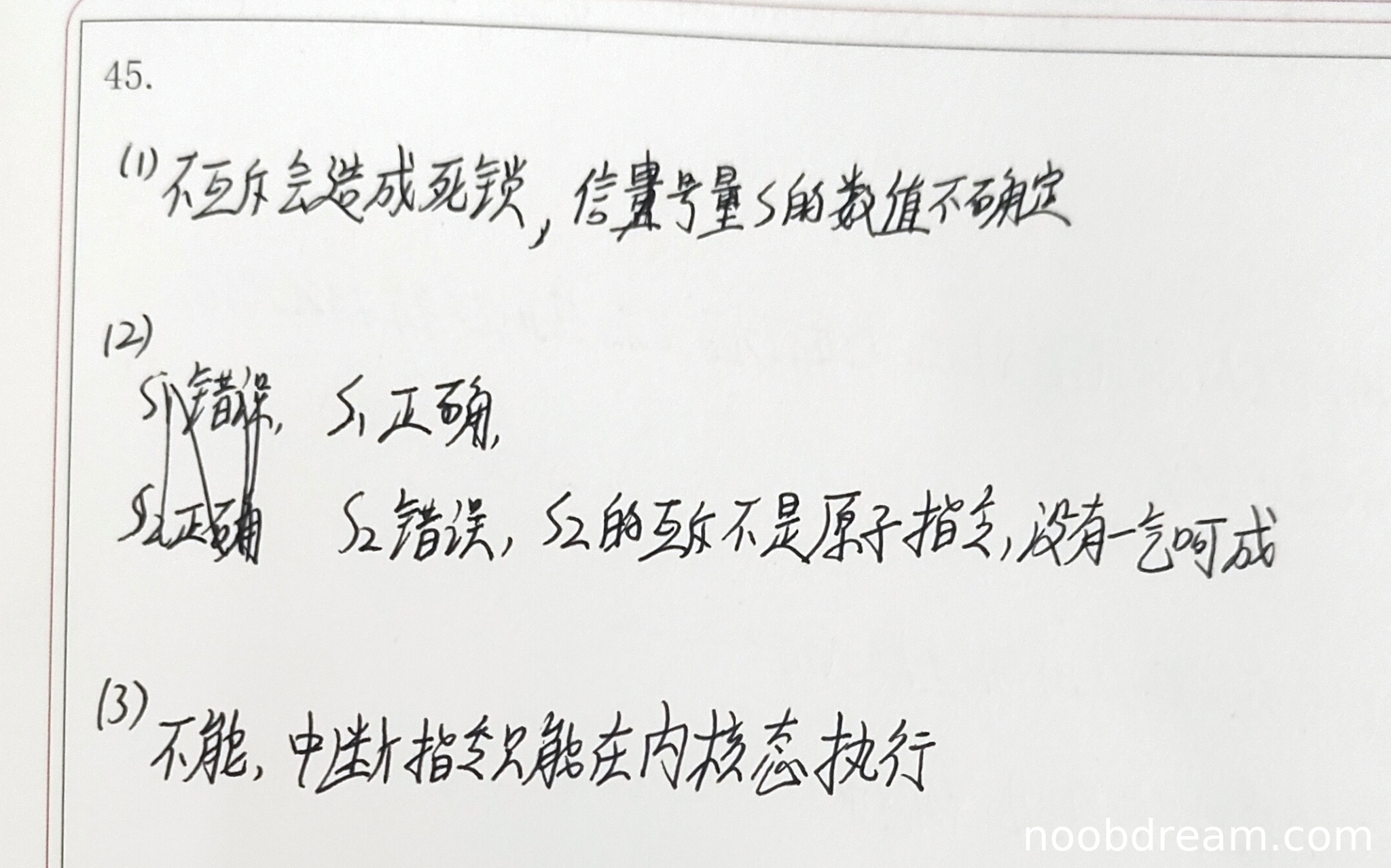 学生回答"不互斥会造成死锁,信号量S的数值不确定",基本正确指出了不互斥会导致的问题。虽然没有明确提到信号量S是共享变量,但指出了数值不确定和死锁问题,涵盖了主要得分点。得2分。