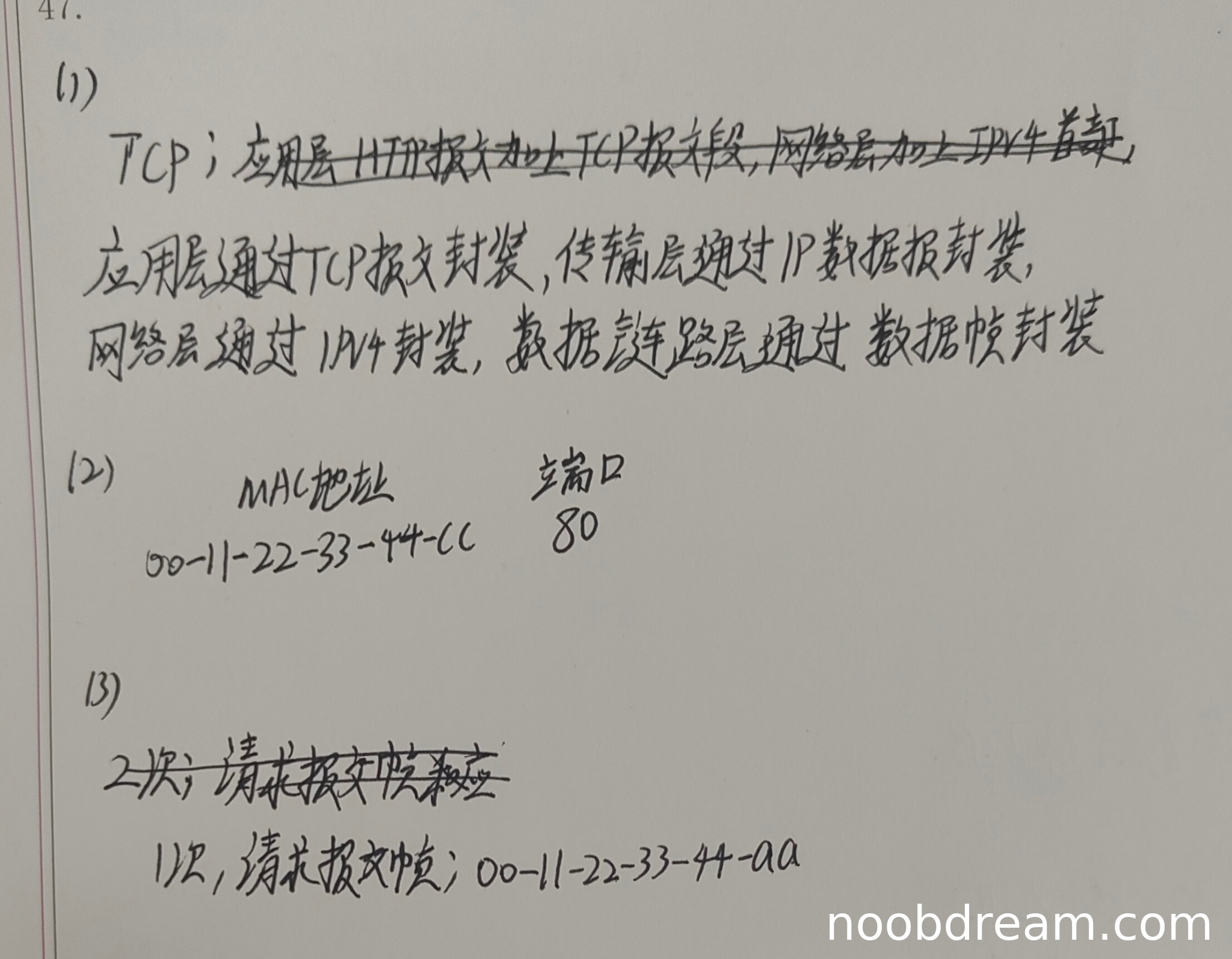 学生回答中H2接收到的帧次数有矛盾(第一次识别说2次,第二次识别说1次),但标准答案是2次。学生提到的帧类型(请求报文帧)和目的MAC地址(00-11-22-33-44-aa)部分正确,但帧类型应为ARP查询报文,目的MAC地址应为广播地址(FF-FF-FF-FF-FF-FF)。由于帧次数和类型描述不准确,且目的MAC地址错误,扣2分,得1分(因为至少正确提到了次数可能为2次,且部分识别结果可能因误写不扣分)。