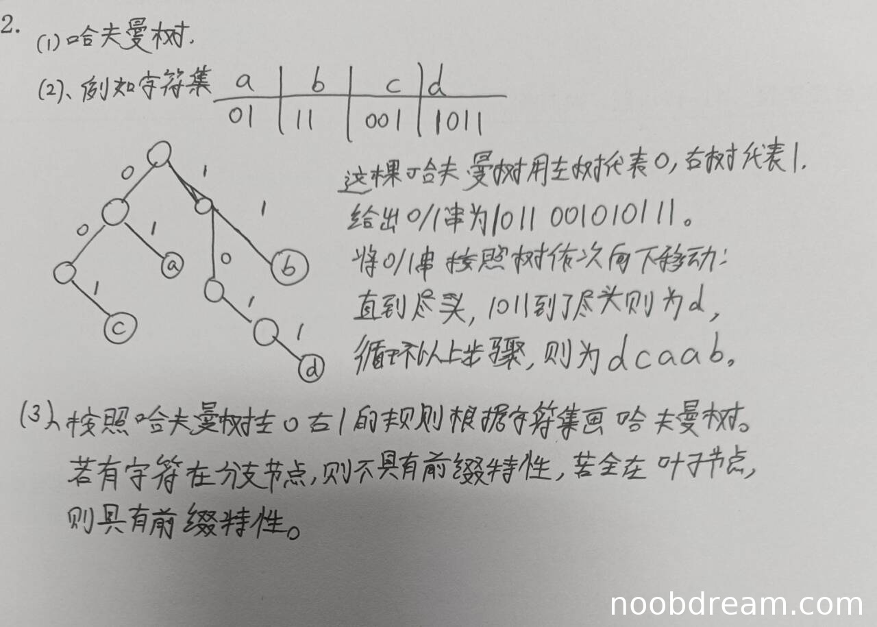 学生回答“按照哈夫曼树左0右1的规则根据字符集画哈夫曼树。若有字符在分支节点,则不具有前缀特性,若全在叶子节点,则具有前缀特性。”这与标准答案中“构造二叉树,字符信息只能存在叶结点中”的判断方法一致,正确描述了前缀特性的判定过程,得3分。