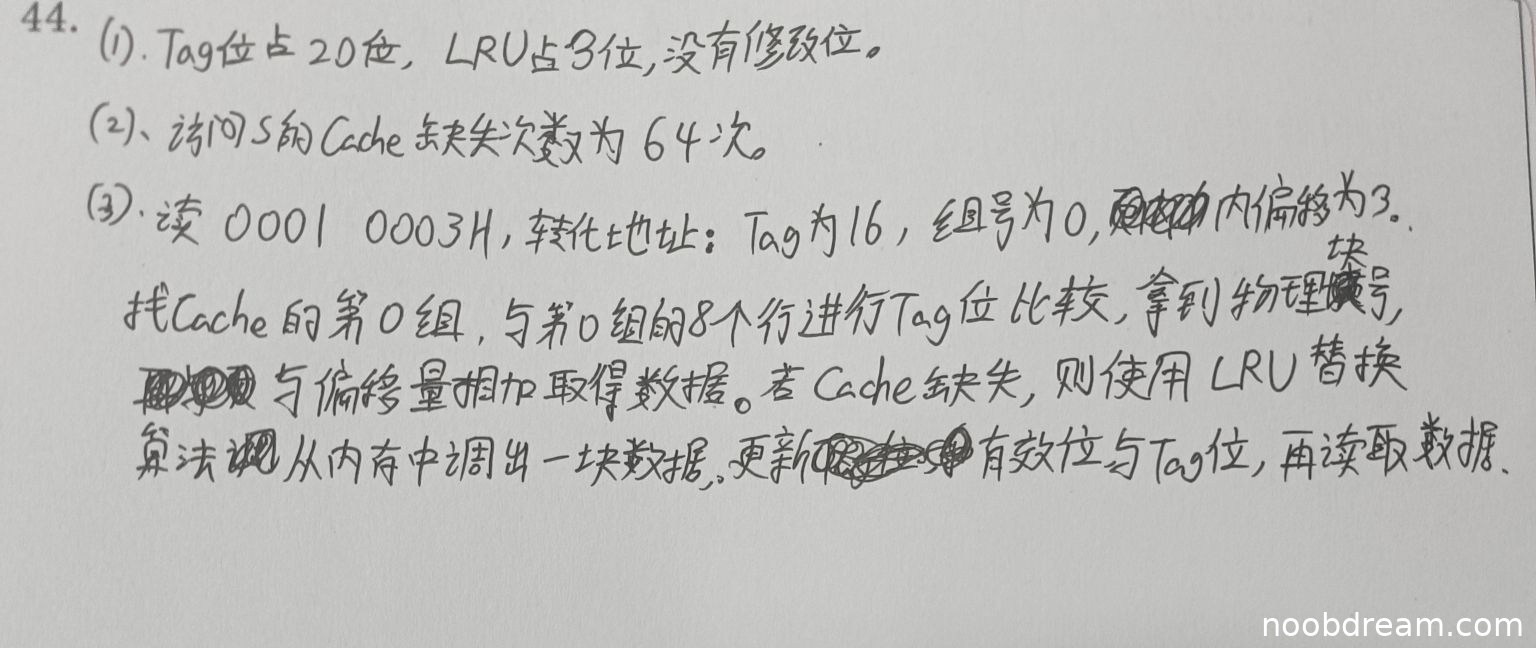 学生答案描述了Cache访问过程,包括地址划分(组号0、块内偏移3)、Tag比较、缺失时使用LRU替换并从内存调数据、更新有效位和Tag位。但答案中“Tag为16”表述不准确(应为高20位,但可能为识别错误或简写),且未明确说明初始时Cache为空导致必然缺失,以及未提及将数据送入CPU的过程。整体思路正确,但细节描述不够完整,扣1分。得3分。
