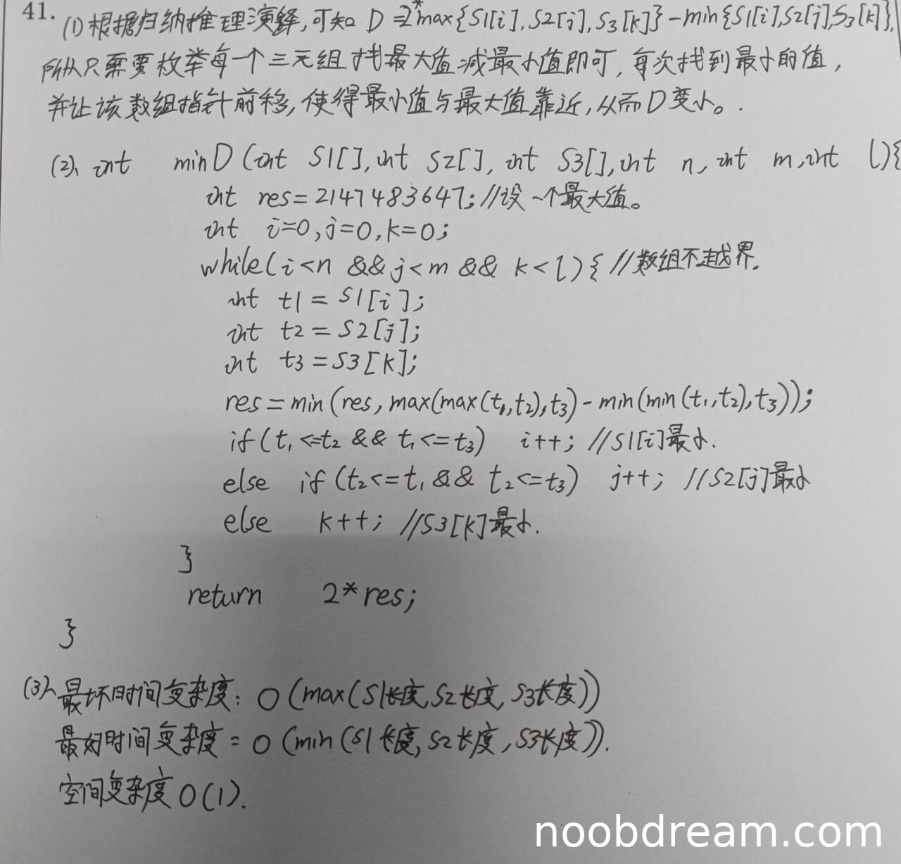 理由:学生正确分析了空间复杂度为O(1),但对时间复杂度的分析不准确。多指针方法的时间复杂度应该是O(n+m+l),即三个数组长度之和,而不是最大值或最小值。由于空间复杂度分析正确但时间复杂度分析错误,扣1分。