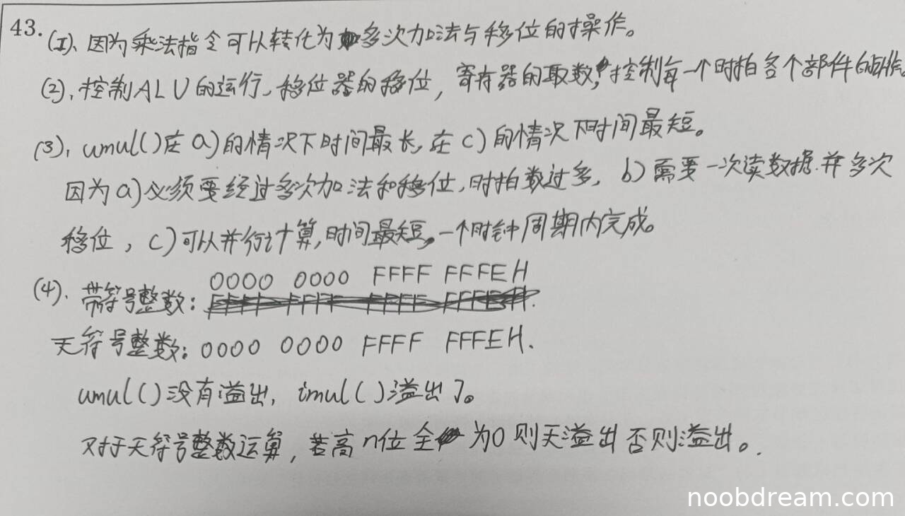 第二问:学生正确指出umul()无溢出、imul()溢出,理由与标准答案一致。得1分。