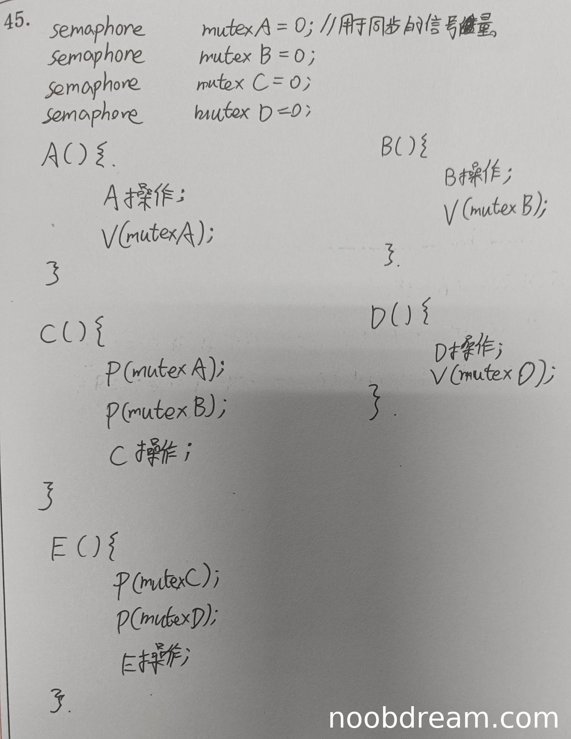 理由:D操作后V(mutexD),E操作前P(mutexD),这正确实现了E必须在D完成后执行的要求。但是E操作前只有P(mutexC)和P(mutexD),缺少了C到E的同步关系,mutexC没有在C操作后被signal,导致E可能无法感知C的完成。