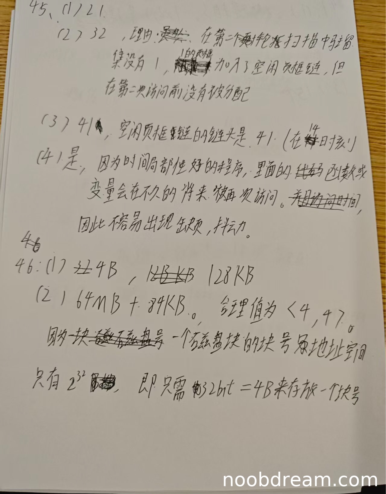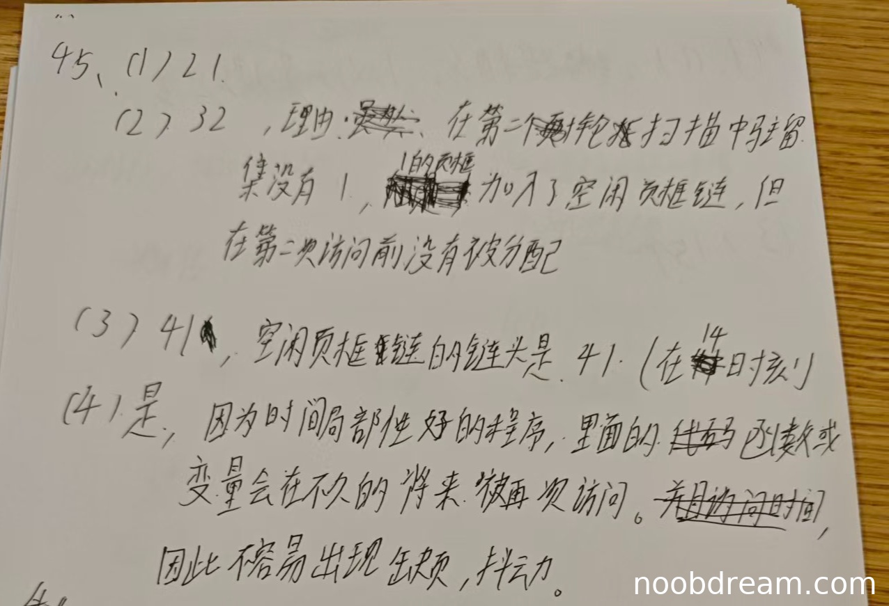 学生两次识别结果均回答“32”,与标准答案一致,得1分;理由部分提到“在第一轮数据扫描中驻留集没有1,加入了空闲页框链,但在第二次访问前没有被分配”,虽然表述不够精确(例如未明确说明扫描轮次和具体时刻),但核心逻辑正确,即页1曾被回收且在空闲链表中被重新访问,因此得1分。本小题总分2分。