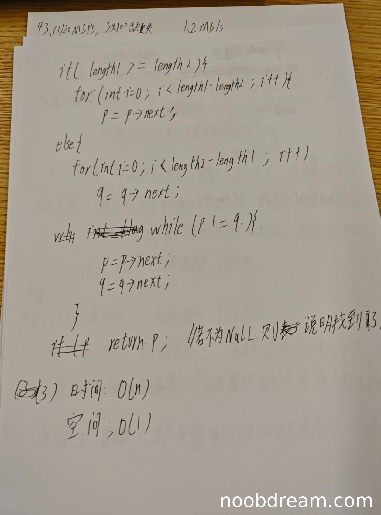 理由:算法实现基本正确,但存在以下问题:①链表遍历计算长度时,p和q遍历后没有正确重置到头结点(虽然代码中有重置,但逻辑不够清晰);②循环条件while(p != q)在找到共同结点时能正确返回,但如果两个链表没有共同后缀,可能陷入死循环或返回NULL;③返回语句的注释"若不为NULL则表示找到了"不准确,因为如果无共同后缀,p和q会同时为NULL。代码整体逻辑正确,时间复杂度符合要求,扣2分。