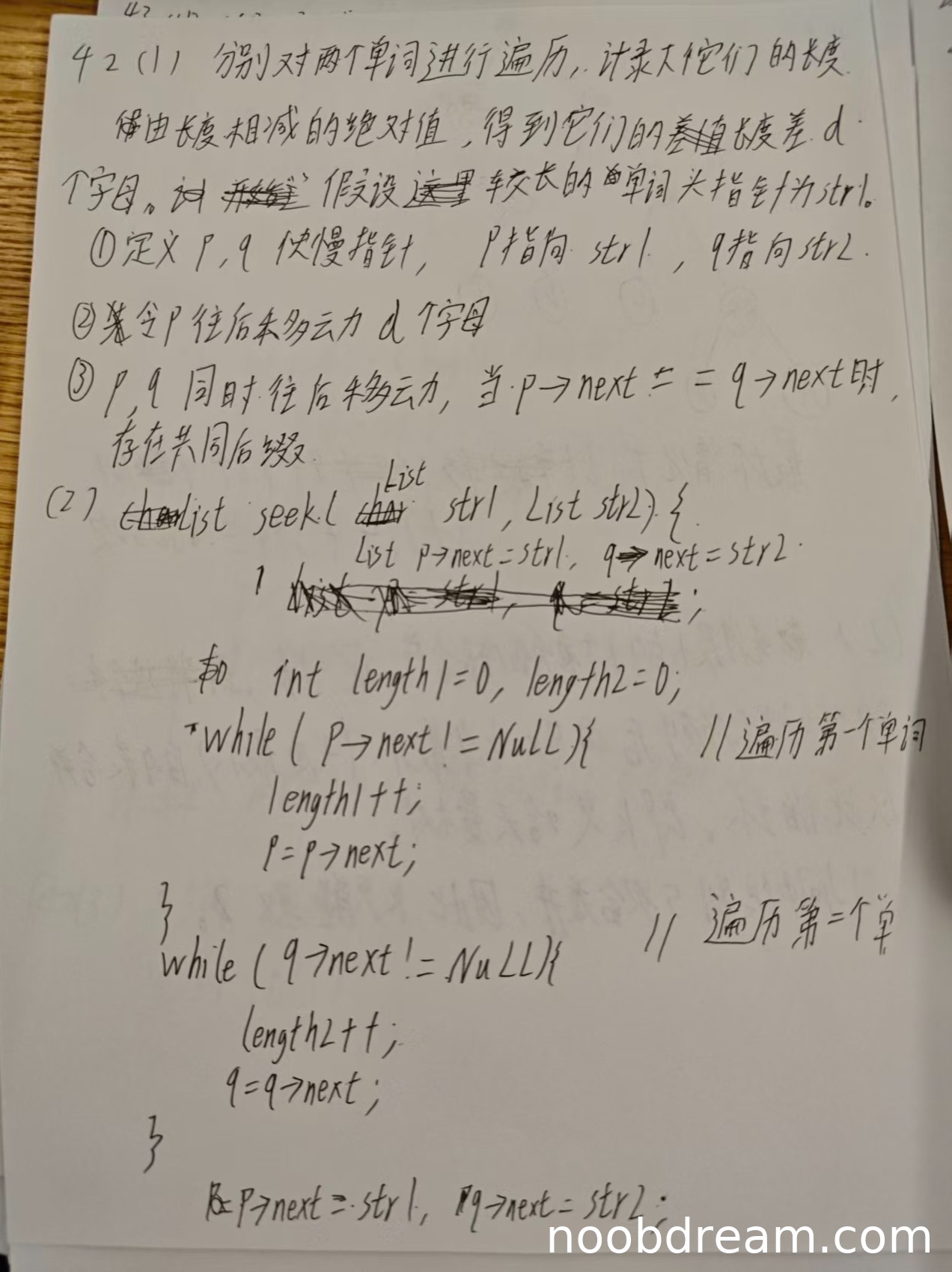 理由:学生的基本设计思想正确,包括计算两个链表长度、根据长度差调整起始位置、然后同步遍历寻找共同结点。但描述中存在一些不准确之处:①在描述中使用了"快慢指针"这一不准确的术语;②描述"当p->next == q->next时"存在逻辑错误,应该是判断p和q是否指向同一结点。由于核心思路正确,扣1分。