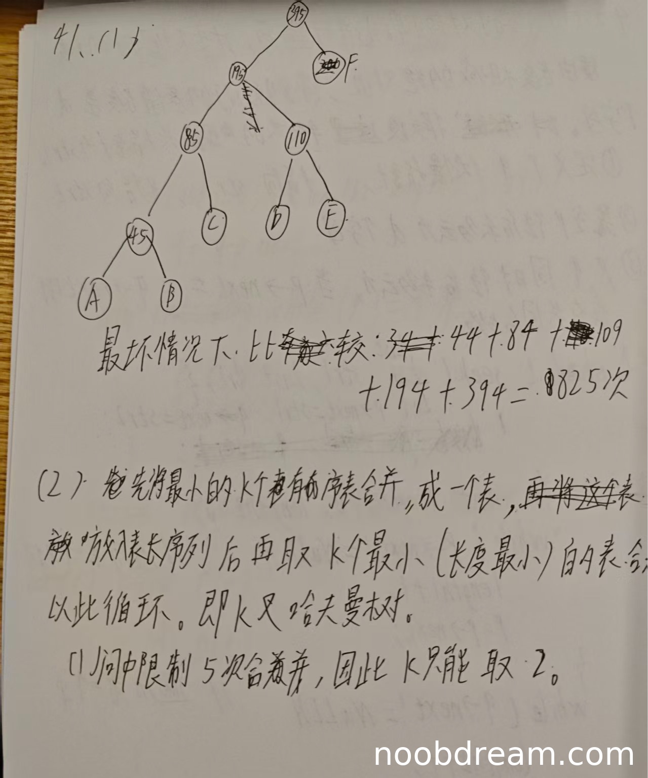 学生给出了合并过程的树形图,节点包括95、F、85、110、45、A、B、C、D、E等,表明采用了类似哈夫曼树的合并策略。但具体合并顺序与标准答案不完全一致(例如标准答案中第一次合并是A+B=45,而学生图中出现95节点,说明可能存在不同的合并路径)。不过根据题目要求,只要采用类似哈夫曼树思想进行合并且过程描述正确即可得分。