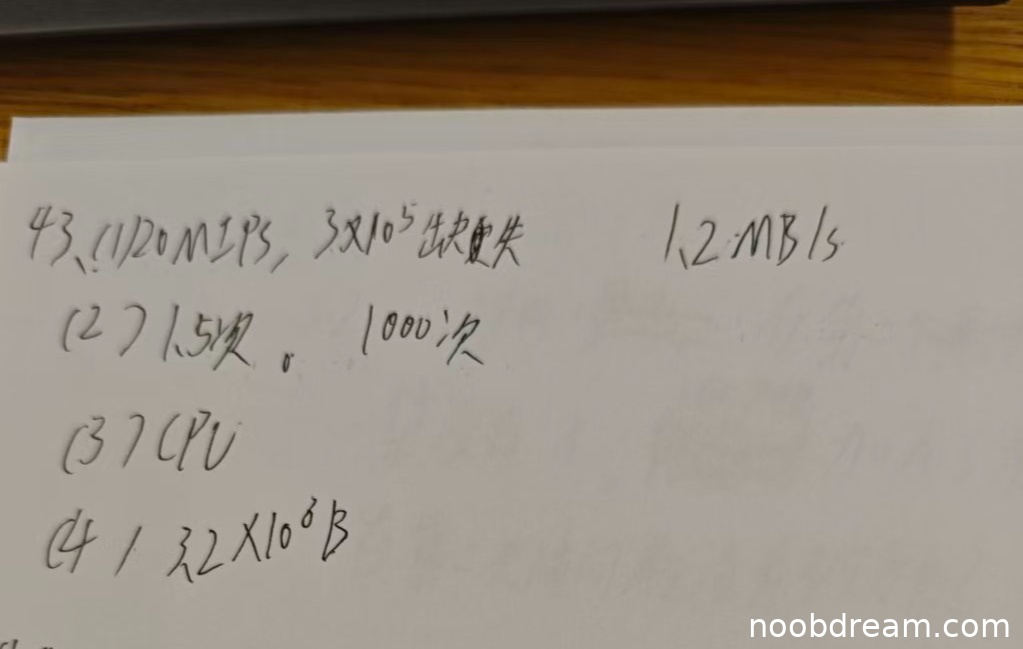 MIPS数计算正确(20MIPS),得1分;Cache缺失次数计算正确(3×10⁵即300k次),得1分;主存带宽计算错误(标准答案为4.8MB/s,学生答案为1.2MB/s),扣2分。本小题得2分。