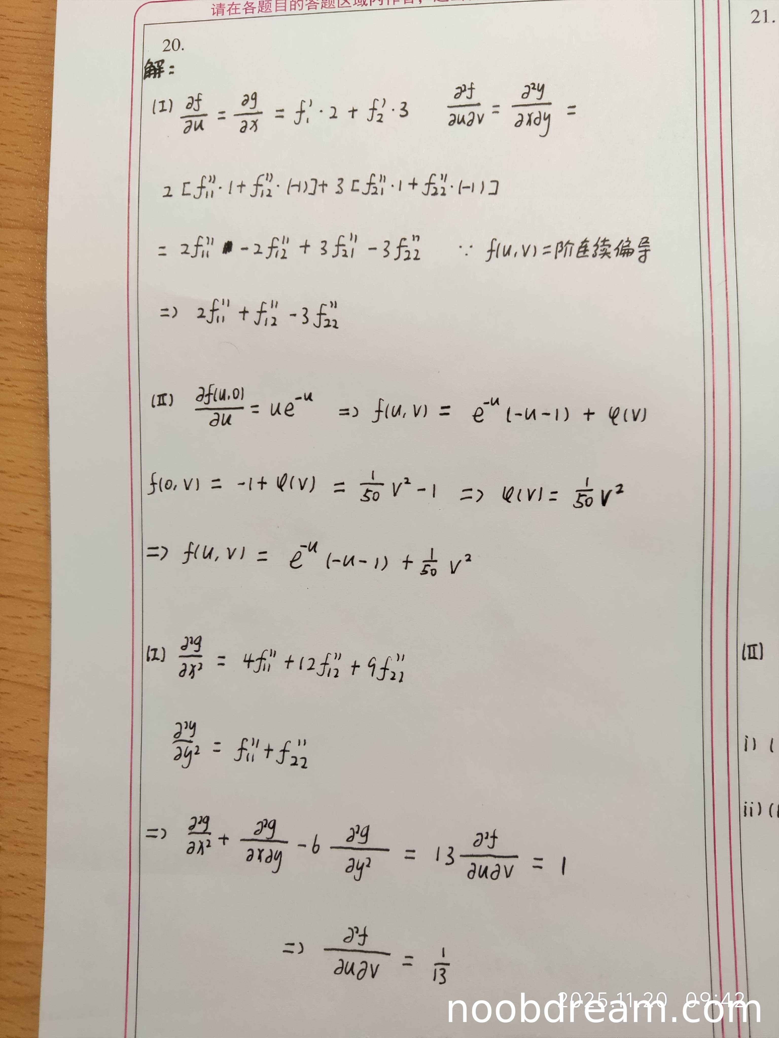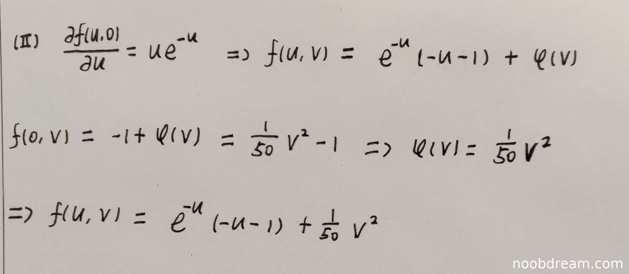 学生在第二部分中,基于错误的 \(\frac{\partial^2 f}{\partial u\partial v} = \frac{1}{13}\) 进行求解,导致后续积分和边界条件应用出现偏差。具体地,学生假设 \(f(u,v) = e^{-u}(-u - 1) + \varphi(v)\),这忽略了混合偏导项的影响,且未正确积分 \(\frac{\partial^2 f}{\partial u\partial v}\)。尽管边界条件应用正确,但整体表达式错误。因此,由于逻辑错误源于第一部分,且第二部分未独立正确完成,扣分较多。