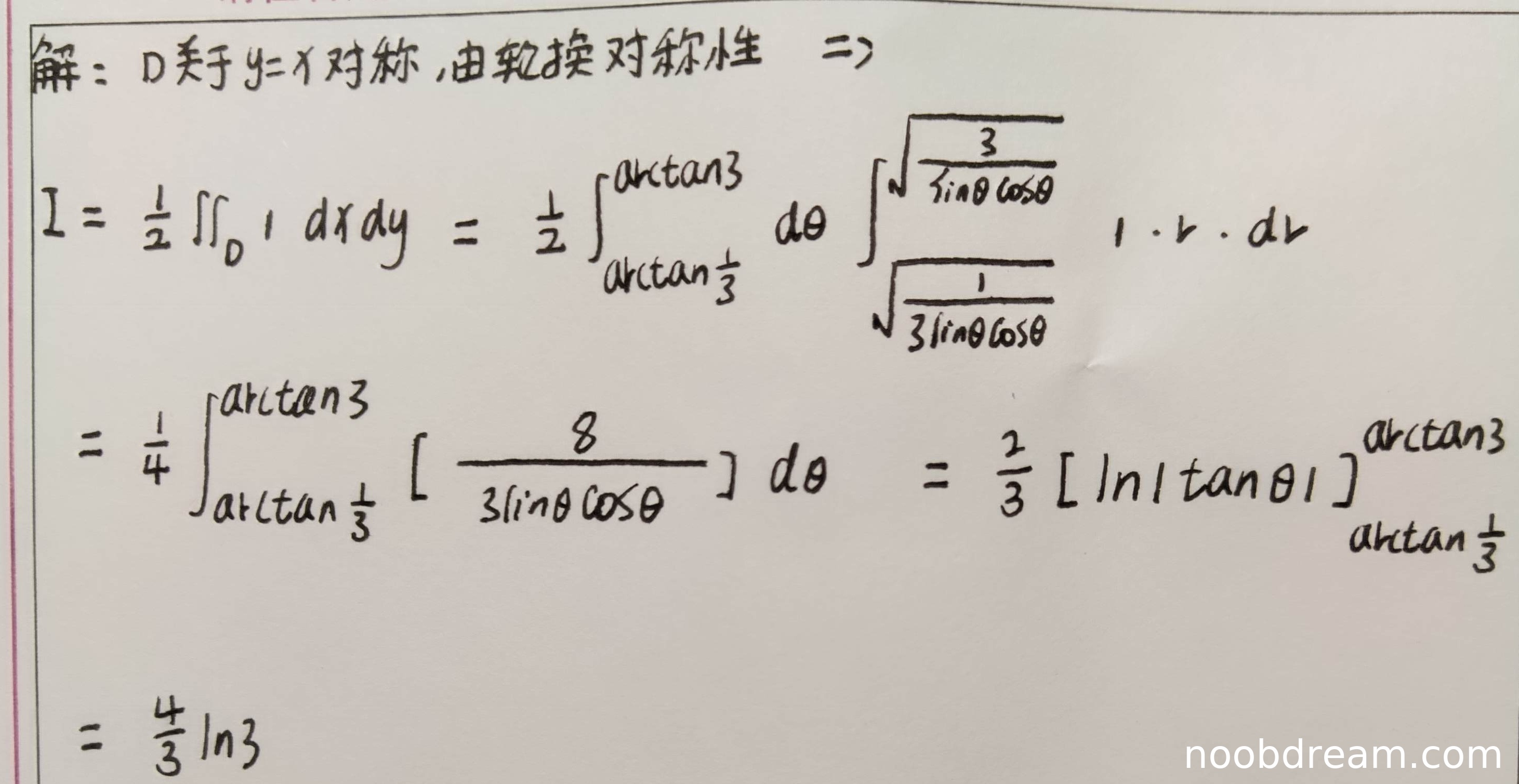 学生正确选择了极坐标变换,并确定了角度θ的积分范围为[arctan(1/3), arctan3],得2分。