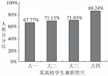 The column chart clearly reveals the statistics of students taking part-time jobs in a certain university. According to the survey, there has been a steady increase from 67.77% to 71.93% of students from freshmen to juniors holding temporary jobs, while the percentage of seniors working part-time has jumped markedly to 88.24%.