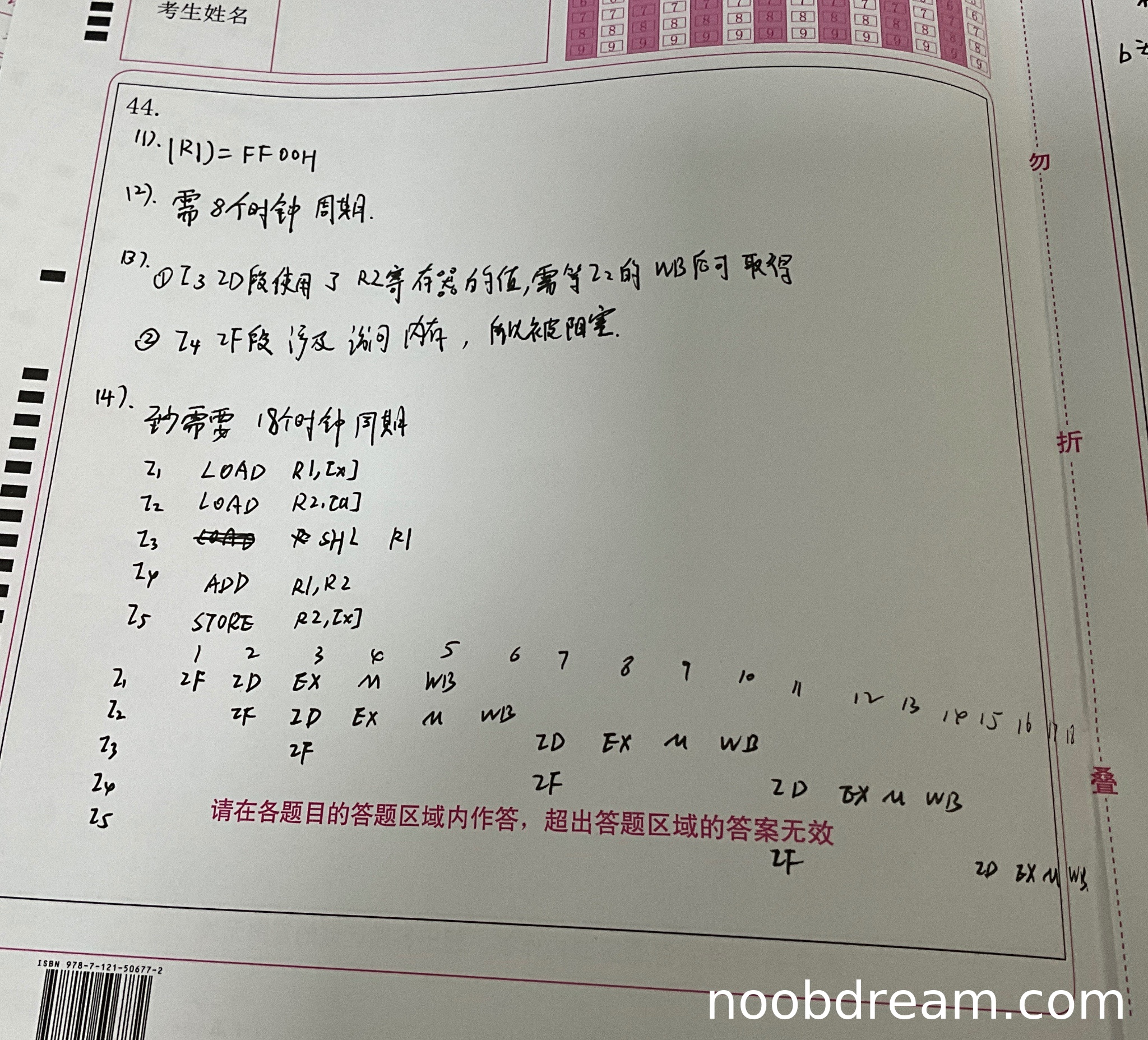 理由:指令序列基本正确(I1 LOAD R1,[x]、I2 LOAD R2,[a]、I3 SHL R1、I4 ADD R1,R2、I5 STORE R1,[x]),得2分。但流水线图完全错误(所有指令都是连续执行,没有体现阻塞),且计算出的时钟周期数18错误,扣5分。