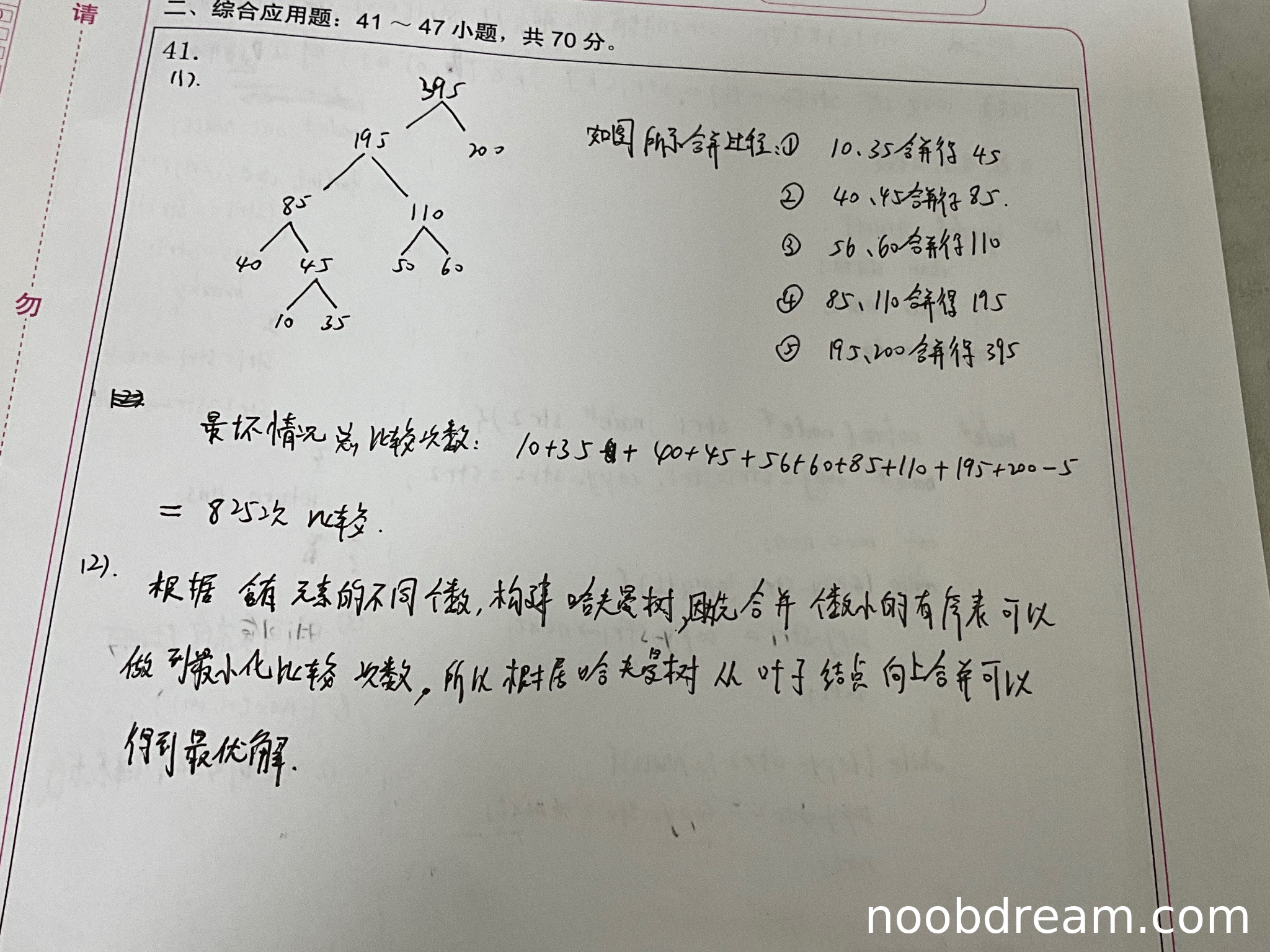 最坏情况下比较次数的计算:学生给出的公式为10+35+40+45+56+60+85+110+195+200-5=825,其中56应为50(识别错误,不扣分)。计算过程与标准答案一致,结果正确,得2分。
