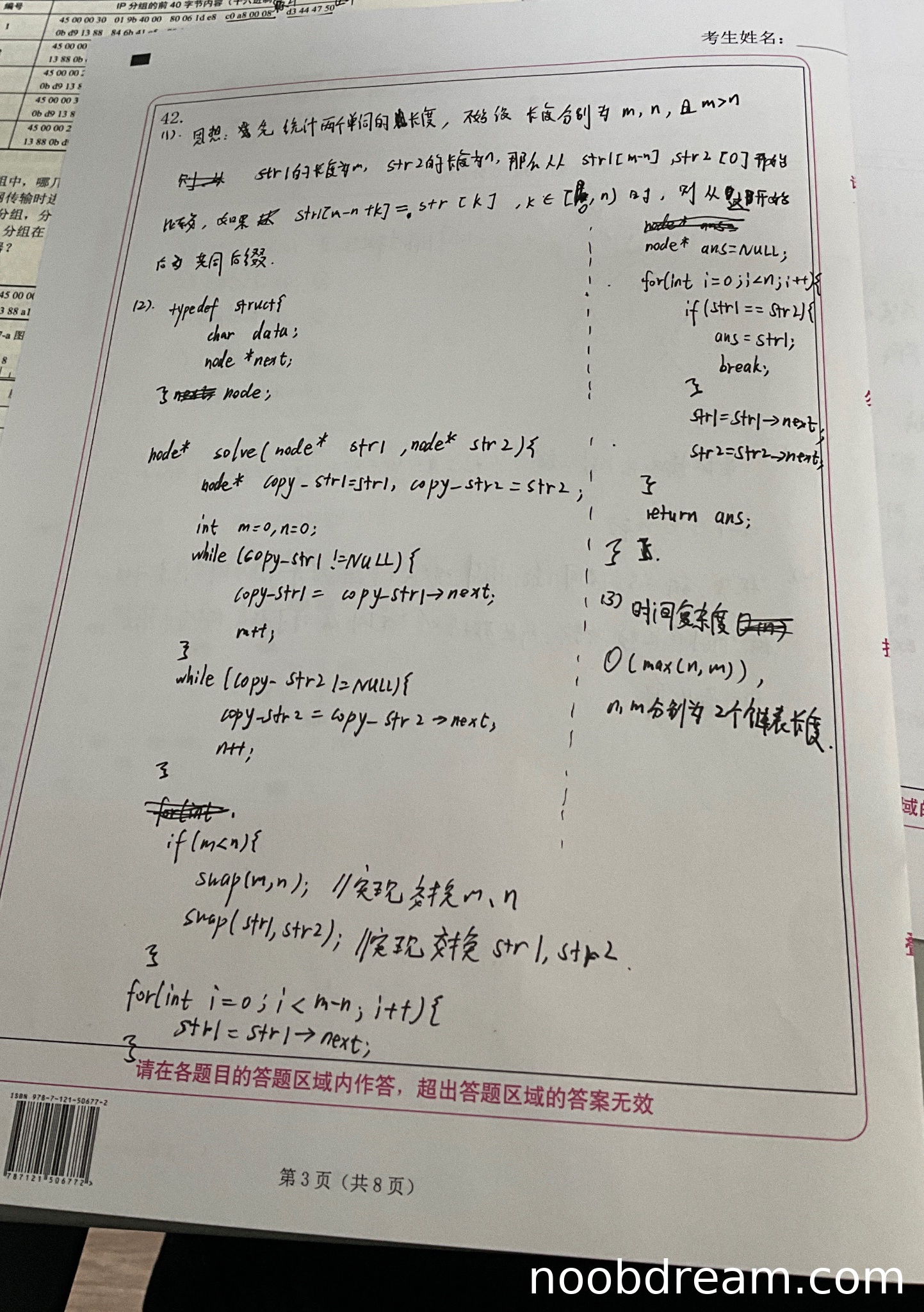 理由:学生的基本设计思想正确,包括计算两个链表长度、对齐链表起始位置、同步遍历寻找公共结点。但描述中存在一些不准确之处:①"从str1[m-n], str2[0]开始比较"的表述不够严谨,应该是让较长的链表先移动差值个结点;②"str1[n-k] = str2[k]"的表述有误,应该是比较结点地址是否相同而非数据值。由于核心思路正确,扣1分。